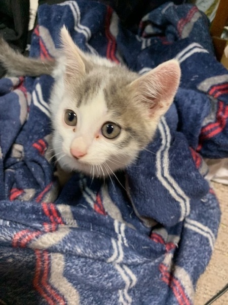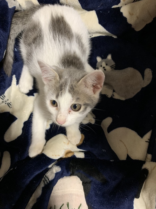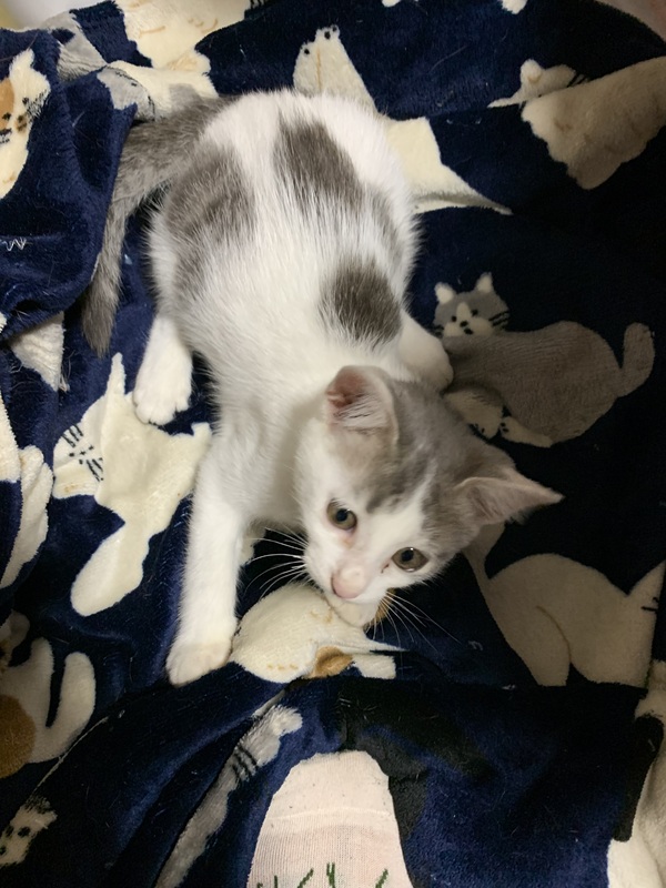 | 特徴(性格など) | サバトラと白の混じった毛色で、八チワレちゃんです。人なつこい女の子で、元気いっぱいです。大きさは両手に乗るくらい、体調は尻尾をのぞいて20cmくらいです。月齢の出し方が分からないですが、2ヶ月くらいな感じです。 | ||