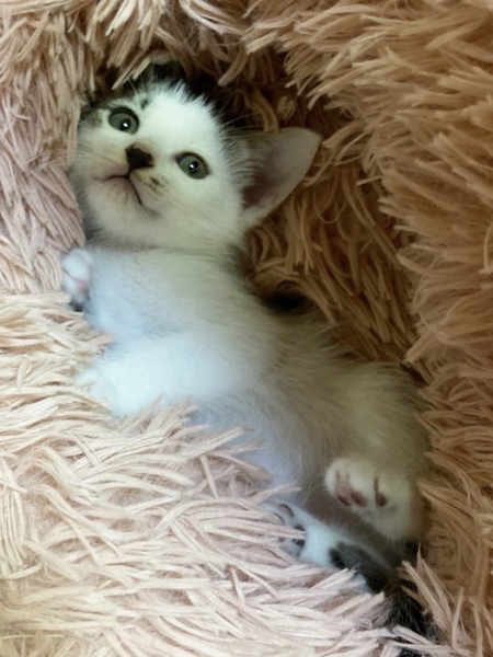 | 特徴(性格など) | ✳︎特徴 正面から見るとキジ白柄なのですが、白い毛の割合がかなり多めです。背中に黒いぶちがひとつだけあります。(兄妹にふたつぶちさんがいます。)短毛なのですが、ママ猫さんが長毛のせいか、ちょっとだけもふっと感があります。 ✳︎性格 元気いっぱいで転げまわって兄妹達と遊んでいます。遊び仲間がたくさんいる事もあって、体当たりして遊んでいます(笑)ゴソゴソ何をしているのかと思うと、みんなで力合わせてティッシュを箱から出していたりするので、ある意味なんでもおもちゃにしちゃう天才です。 ママ猫さんがずっと授乳をしていましたが、生まれた時からずっと保護主さんのお宅で生活しているので、人見知りは全くありません。むしろグイグイ寄ってくる甘えん坊の女の子です。 ✳︎健康状態 4月30日生まれで、今のところ健康状態は良好です。 寒暖差が大きくなると何度か体調を崩し、その都度受診をしておりますが、入院するほど悪化することなく回復しています。 快食、快眠、快便と三拍子揃っています!血液検査は陰性です。 これから4ヶ月くらいまでの間は、子猫さんの社会性が育つ時期になります。取っ組み合いの喧嘩をしながら、甘噛みの加減を覚えたり、追いかけっこしながら、動体視力を養っていきます。 できれば、2頭一緒に迎えてくださるお宅や、一緒に遊べる若い先住猫さんがいるお宅、お留守番があまり長くなく猫さんと一緒に遊ぶ時間が十分取れるお宅を優先させていただきたいと考えております。 |