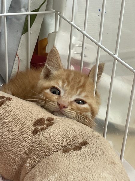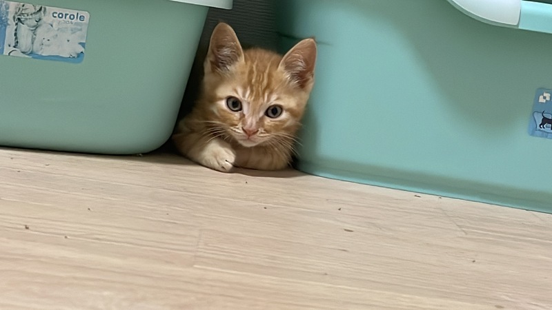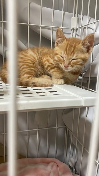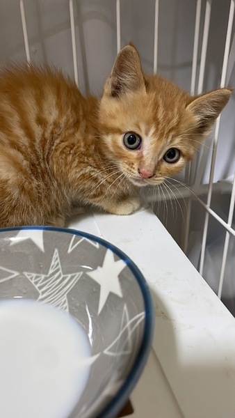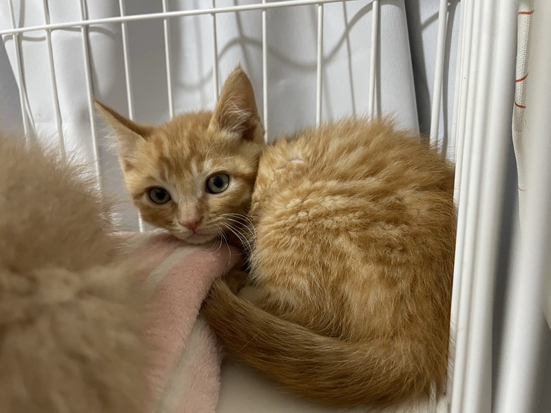 | 特徴(性格など) | 仮名:トラ 性別:オス 年齢:2ヵ月程度 体重:580g 毛色:茶トラ 性格:好奇心旺盛。甘えん坊。 病歴:なし その他:トイレトレーニング済み ※①のちびちゃんと兄弟です。 健康状態は大変良好です。 食欲は旺盛です(カリカリOK) 検便検査-。ブロードライン済。 猫白血病陰性、猫エイズ(FIV)は小さいため未実施です。 |