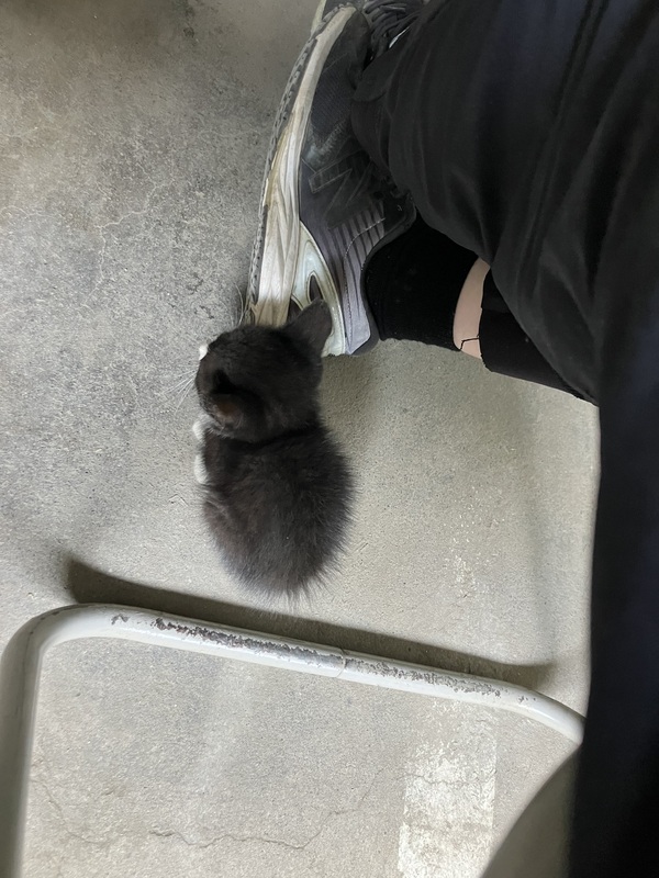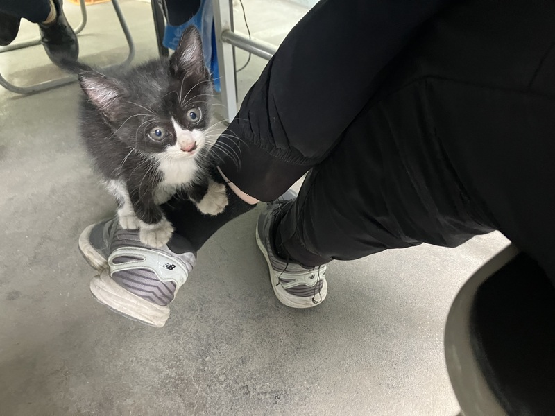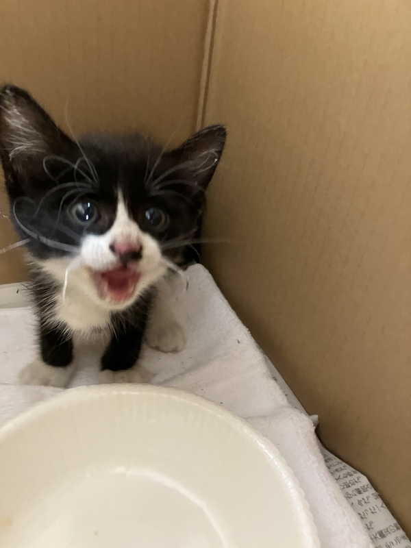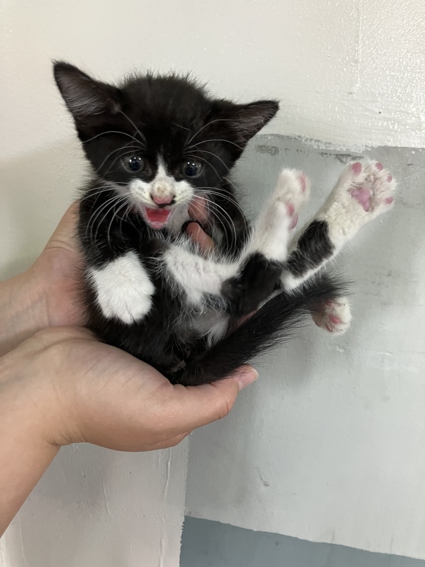 | 特徴(性格など) | 生後1ヶ月ほどの子猫です。白黒のハチワレ柄です。甘えん坊で人になついています。病院でも平気で受診していました。 | ||