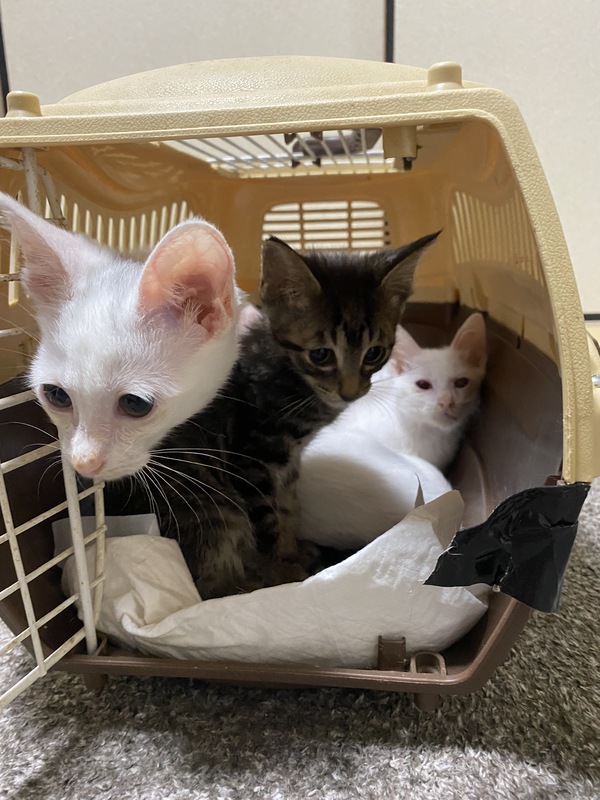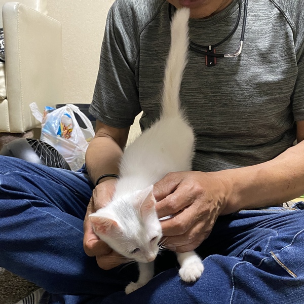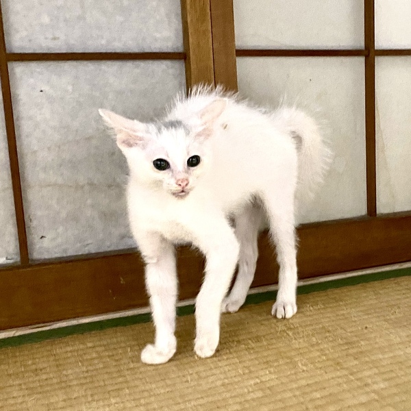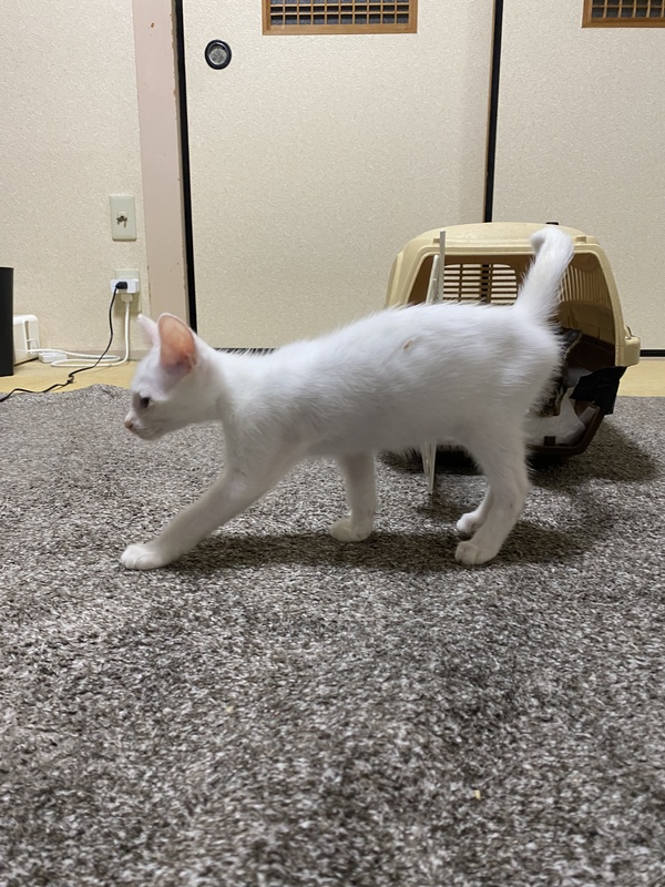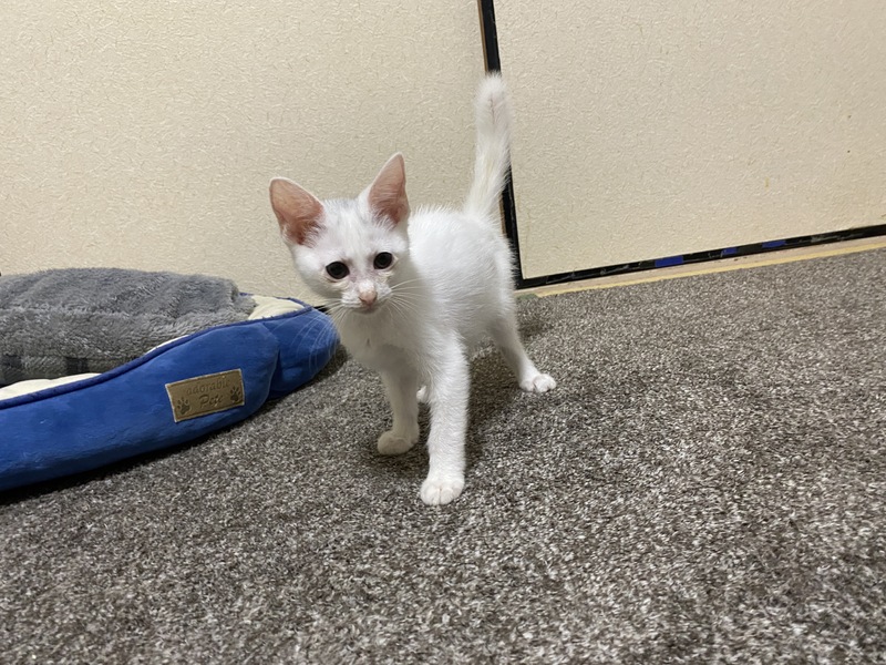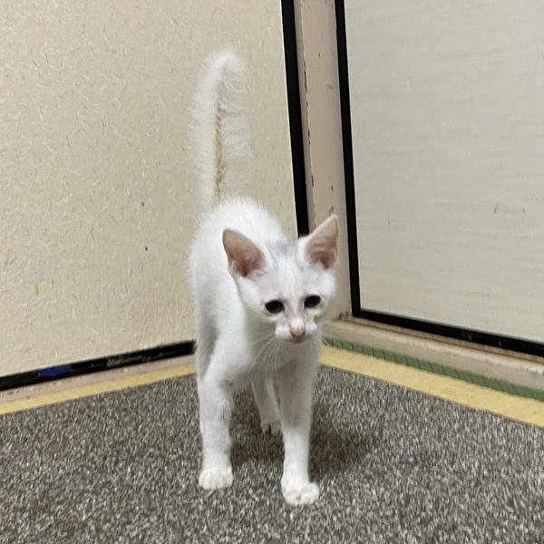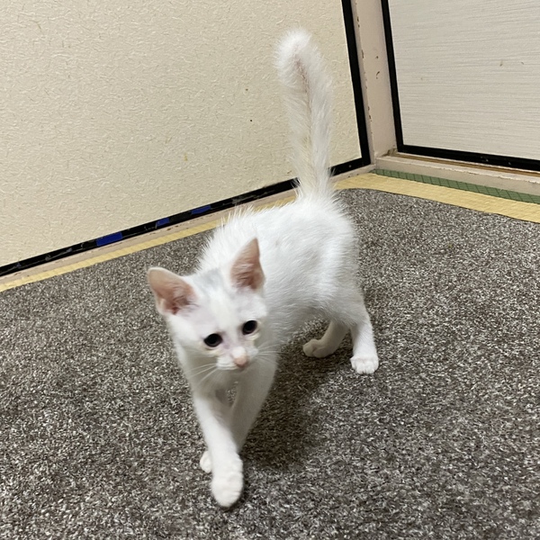 | 特徴(性格など) | 男の子ばかり4人兄弟のひとりです。 性格は、やんちゃ、活発。人馴れしています。 毛の色は全身白で、ひたいにうすいM字のマーク?があります。 ノミ取り済・ワクチン・血液検査未 風邪っぽく、涙目あり、目薬と投薬中、抗生剤注射し様子を見ています。 |