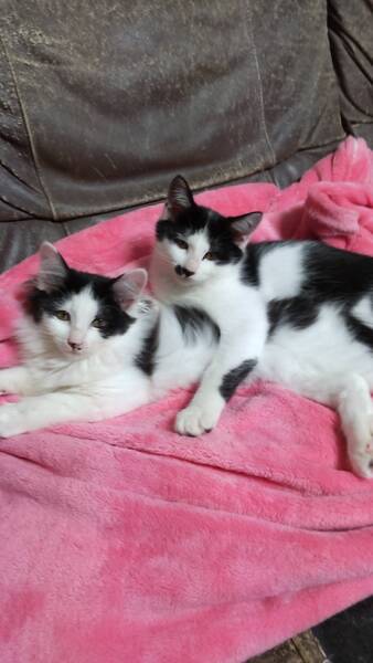 | 特徴(性格など) | 2022年8月生まれの白黒兄妹左が妹、長毛です。右がお兄ちゃん。少し写真わかりぬくいですが妹は長毛でふわふわの毛並みです。 お兄ちゃん短毛ですが人懐っこく甘えん坊なとても賢い子です。 避妊去勢済、ワクチン2回づつ済、ノミ、ダニ駆除。お腹の無視駆除。 ウィルス検査マイナスです。 |