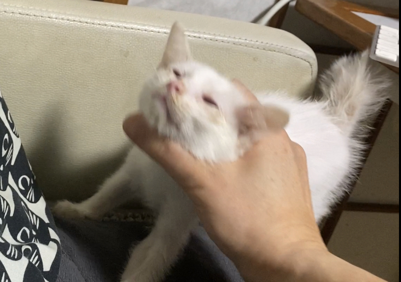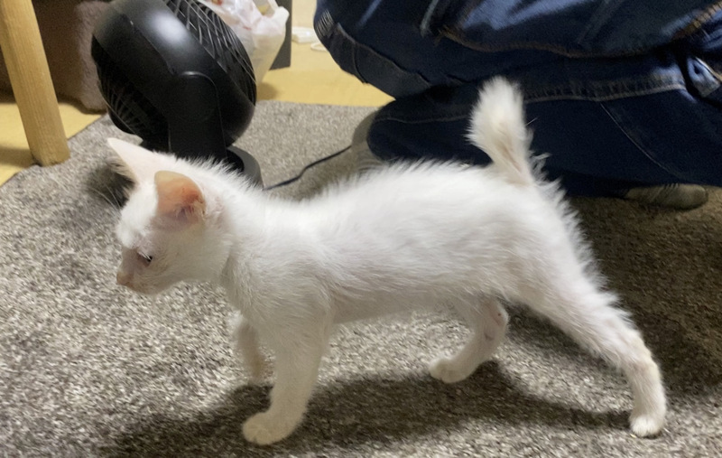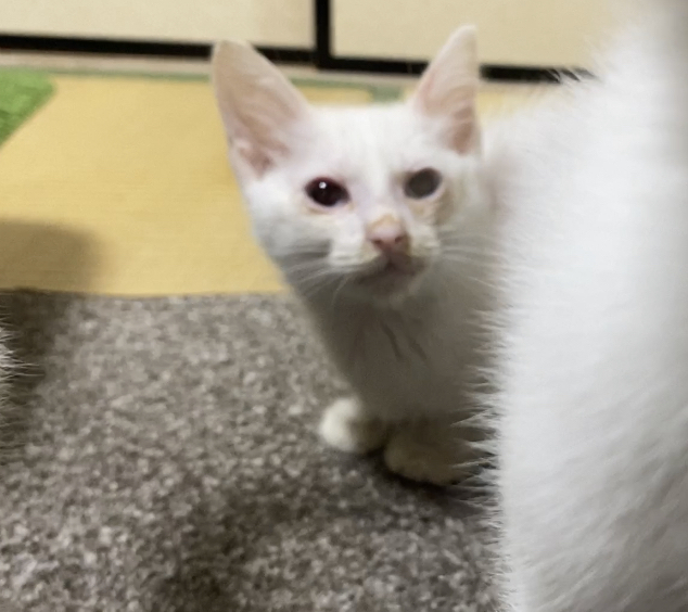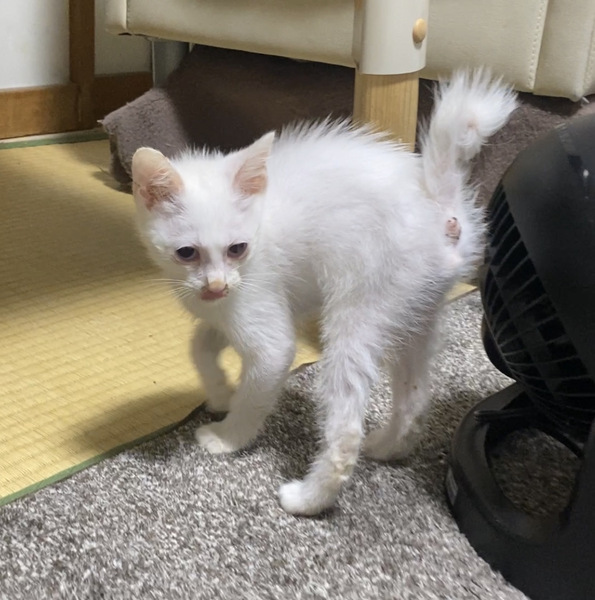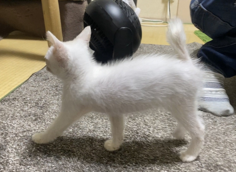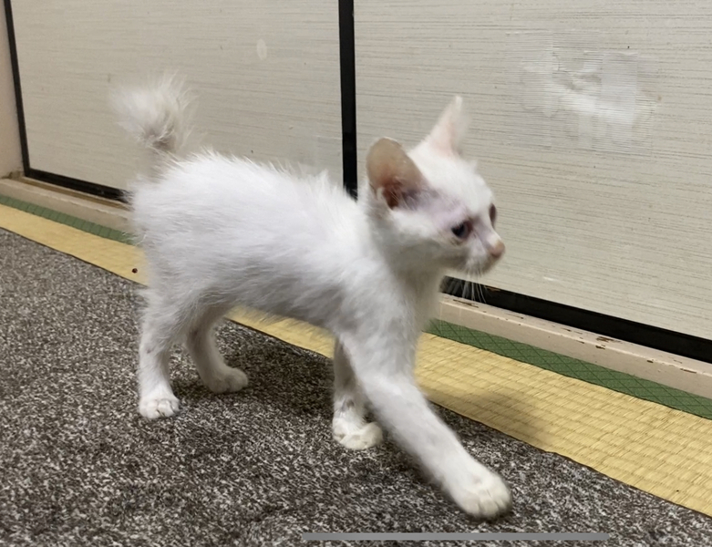 | 特徴(性格など) | 毛色は全身白色で、性格は人懐こく、やんちゃで元気いっぱい。 しっぽが短めのかぎしっぽ。 男の子ばかり4人兄弟のひとりです。 生まれてから外に出したことがないので、外の世界を知りません。 室内飼い向きです。 ノミ取り済・ワクチン・血液検査未 風邪っぽく、涙目あり、目薬と投薬中、抗生剤注射し様子を見ています。 |