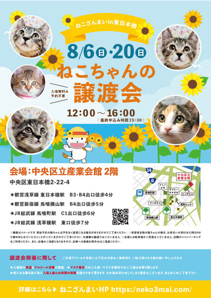 | その他(譲渡条件など) | 11:30より、2階会場入口にて受付を開始します。 受付時に入場予定時間が記入された整理券をお配り致しますので、整理券を受け取った方はお時間になりましたら2階会場入口に番号順にお並び下さい。 ※11:30より早くいらしてもお待ちいただく場所がございません。 また、近隣にお住まいの方や他階フロアのご利用者様にご迷惑となる場合がございますので、受付開始時間にあわせてお越しくださいますよう、何卒ご協力お願いいたします。 ※ねこざんまい譲渡会は、先着順で里親様を決定する譲渡会ではありません。 先に申し込みをした方を優先することもありません。 お話をして、その猫ちゃんに合ったおうちに決めさせていただいております。 12時に開場し、里親様の決定は14時以降となります。 14時以降にご入場の場合、希望の猫ちゃんが決定している可能性があります。 また1頭に対し多数のご希望をいただいた場合、早めに申し込みを締め切らせていただく場合がございますので、予めご了承下さい。 里親様決定は14時以降となります。 その後、迎え入れ準備の説明等のお時間も頂戴しますので、お時間に余裕を持ってご来場下さい。 ~~~~~~~~~~~~~~~~~~~~~~~~~~~~~~ ★仔猫ご希望の里親様★ 仔猫ちゃんたちは、まだ体がしっかりしていない赤ちゃんです。 下痢だけでも数時間対応ができなかっただけ死に至る事もあります。 その為、月齢に応じたお留守番時間を設けさせていただいております。 また、子猫ちゃん(6ヶ月未満)の里親様には子猫支援金のご協力をお願い致しております。 ★猫ちゃんとのお見合いは譲渡会で!★ ねこざんまいの猫ちゃんは譲渡会でのお見合いのみとなります。 『この子はいつ譲渡会に参加するの?』『譲渡会場の場所はどこ?』などは、ねこざんまいホームページをご覧ください。 https://neko3mai.com/ ★楽しく猫ちゃんと触れ合って★ ねこざんまい譲渡会は、猫ちゃんも里親様も保護主も笑顔で過ごせる譲渡会を目指しています。 これから20年以上、楽しい時も、悲しい時もいつも傍にいてくれる大切な家族になる猫ちゃんです。 会場には沢山の猫ちゃんがいます。 1匹1匹、触れ合って猫ちゃんとお話してください。 『初めて猫ちゃんを家族に迎える方』 『先住猫ちゃんのお友達を迎える方』など トライアルの仕方や先住猫ちゃんと仲良くなるコツなど経験豊富な保護主やスタッフにお気軽にご相談ください! 猫を愛し、そして猫に愛されている猫好きスタッフと保護主がアドバイスさせていただきます。 ★里親希望のみなさまへ★ ペットではなく、家族一員としてたっぷり愛情を注いでくださるご家庭をお待ちしております。 恐れ入りますが ●学生の方 子猫・幼猫希望の60才以上の方のみのご家庭 ●脱走防止対策にご協力いただけない方 は原則譲渡を遠慮させていただいております。 ●一人暮らし・同棲(事実婚)の方 保護主の希望や猫の年齢・性格等により、ご希望に添えない場合もございます。 参加猫ちゃんは、それぞれ保護主(実際に猫ちゃんを自宅に入れ、保護をしている方)が異なります。 詳しい条件なども異なる場合がございますので、会場内で直接保護主とお話ください。 〖共通条件〗 1.終生飼育 2.完全室内飼い 3.脱走防止対策へのご協力 4.避妊去勢手術 5.契約書類へのサイン 6.定期報告 7.医療費等の負担 当日の猫ちゃんを連れて帰ることはできません。後日、保護主が里親様のご自宅までお届け致します。 その為、移動の際の猫ちゃんの負担を月齢などから考慮し、お届け地区を限定させて頂くこともございますのでご了承ください。 ご理解とご協力のほど宜しくお願い致します。 ☆よくある質問☆ ・譲渡の条件 ・ご負担頂く費用 ・譲渡会の場所等は ホームページに詳しく掲載させて頂いておりますのでご覧ください。 https://neko3mai.com/ メールでのお問い合わせはすぐにご返答出来ない場合がございますのでご了承ください。 ホームページ https://neko3mai.com/ お問い合わせ http://www.neko3mai.com/contact/form_general.html ねこざんまいブログ http://ameblo.jp/neko3mai/ |