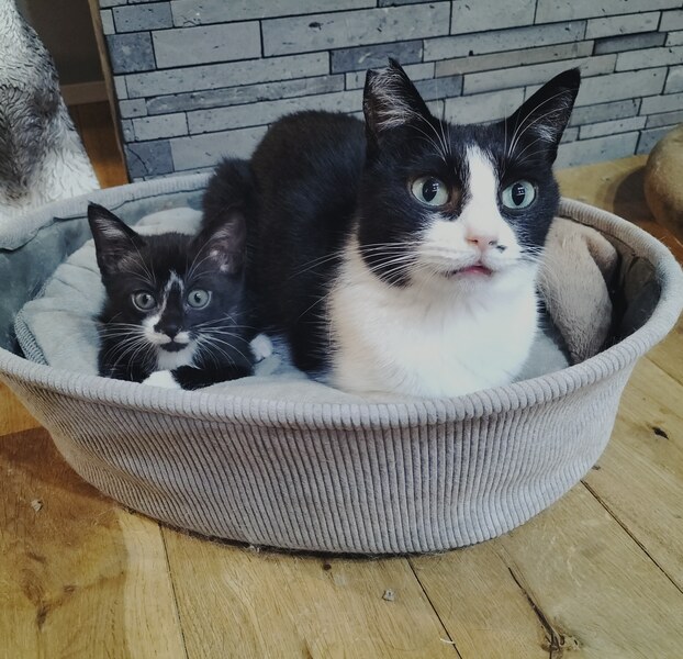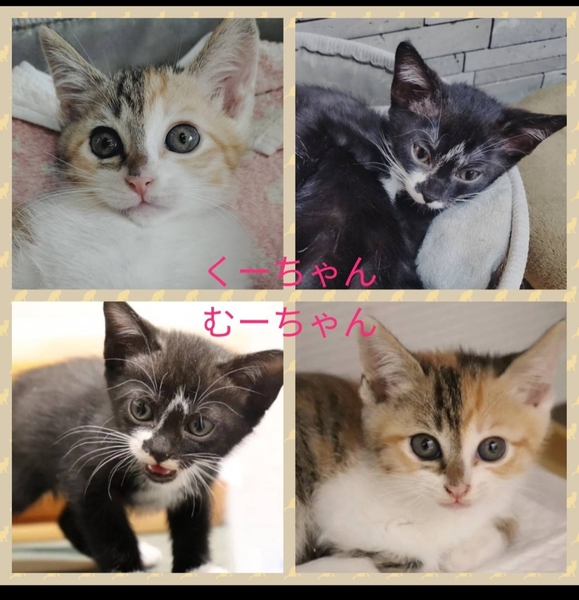 | 特徴(性格など) | くーちゃん、むーちゃんです むーちゃんは少しビビりなところがありますが、ちゅーるには勝てません。 モリモリ食べて、遊んで、寝て元気です。 |