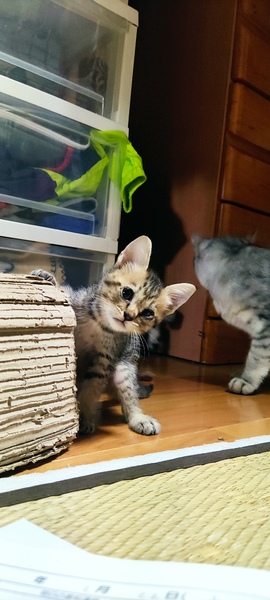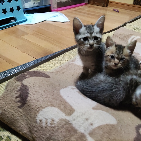 | 特徴(性格など) | オスが三匹メス三匹、そのうち一匹ずつが茶トラ残り四匹がサバトラになります。 みんなやんちゃで元気です!茶トラメスの方が目が開けづらいみたいです。 |
