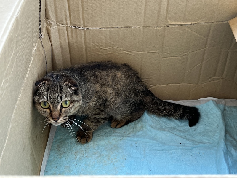 | 特徴(性格など) | キジトラ猫、耳が倒れているため、スコティッシュの血が入っていると思います。非常におとなしく、優しい性格です。 くる病と腎臓病の疑いがあります。 |