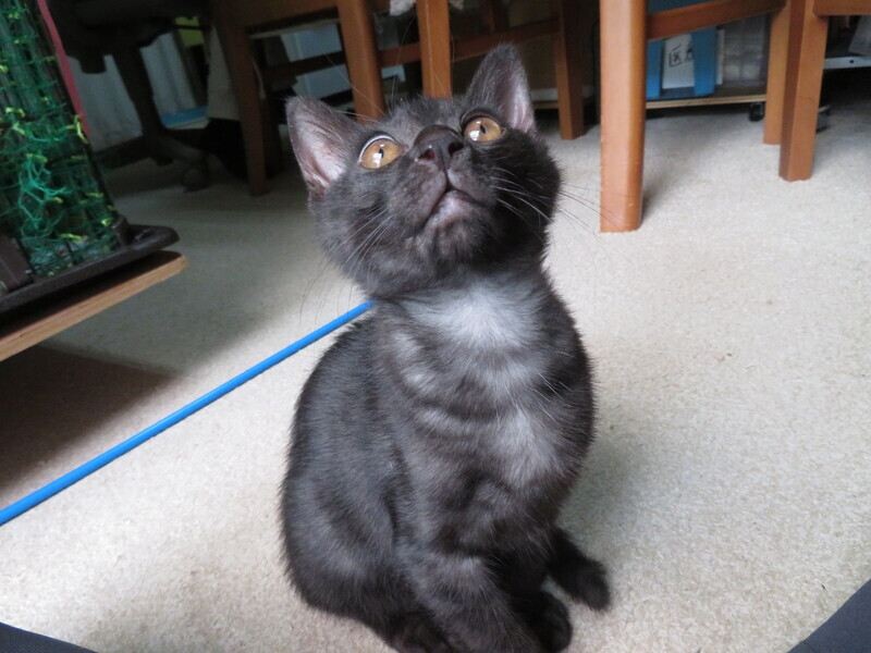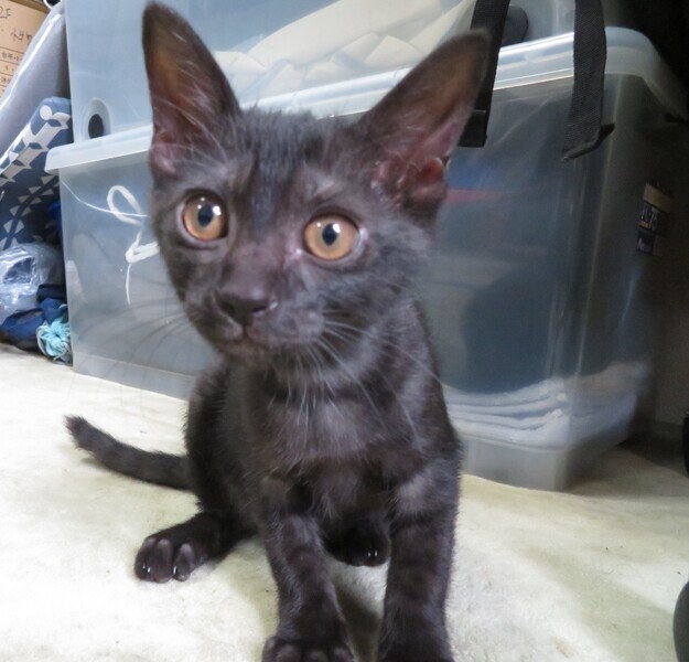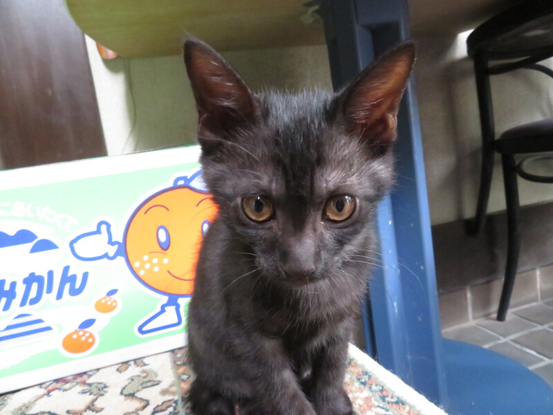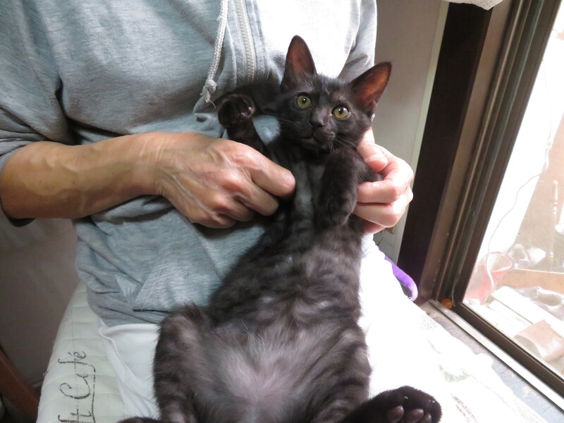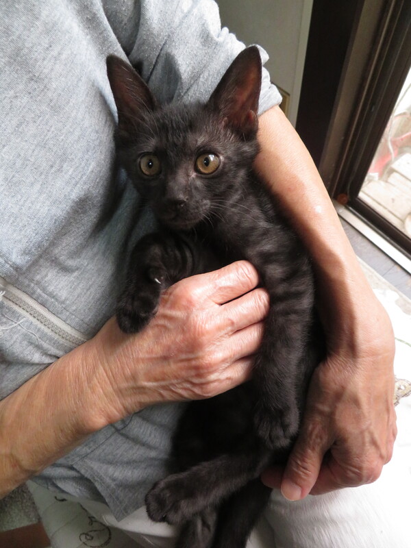 | 特徴(性格など) | 生後数日からミルクで育てているので人によく馴れています。初めて見る人にもすり寄っていきます。椅子に座っていると膝に飛び乗ってきて、抱くとすぐにゴロゴロいいます。人に抱かれるのが好きです。他の保護ネコや大人のネコとも仲良く遊びます。元気で活発に動き回り好奇心旺盛で部屋中を探検します。食事は子猫用のドライフードをよく食べます。水も器から自分で飲めます。トイレはシステムトイレに慣れています。猫じゃらしやボールで遊ぶのが好きです。毛色は黒ですがお腹の辺りを中心に縞模様があります。尻尾の先っぽが触ったら気づく程度に少し曲がっています。 | ||