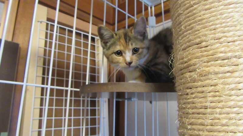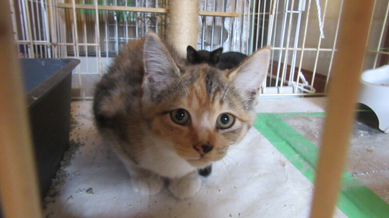 | 特徴(性格など) | 三毛と黒の仲良し姉妹です。 まだ保護されて間もない為、人慣れはこれからです。 今はケージの中にいて、近ずくと逃げてしまいますが 子猫なのですぐに慣れると思います。 シャー!は言いません。 トイレの躾出来ています。 ワクチン接種と虫落としは近日予定しています。 |