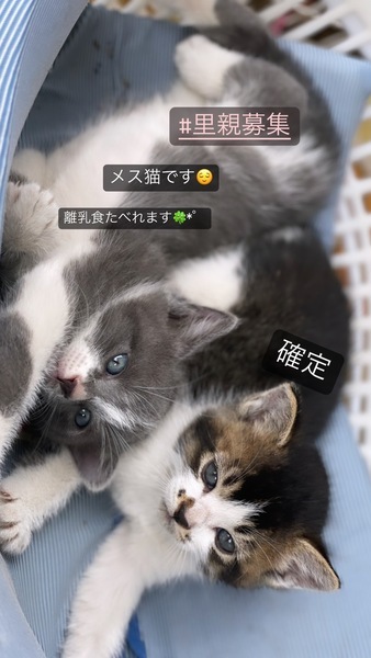 | 里親募集する理由 | 黒茶の子♂は、ほぼ里親確定とのこと。「ほぼ」なので完全確定ではない状況です。 グレーの子♀は引き続き里親募集中です。 私の友人の里親募集の手伝いをしています。自宅の庭に住み着いている野良猫が子猫を産み、子猫を保護したそうです。 |