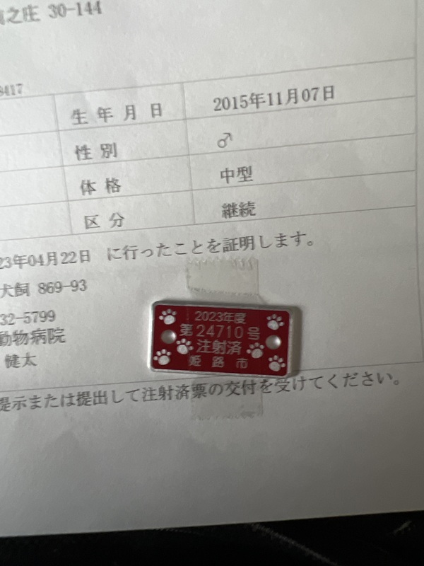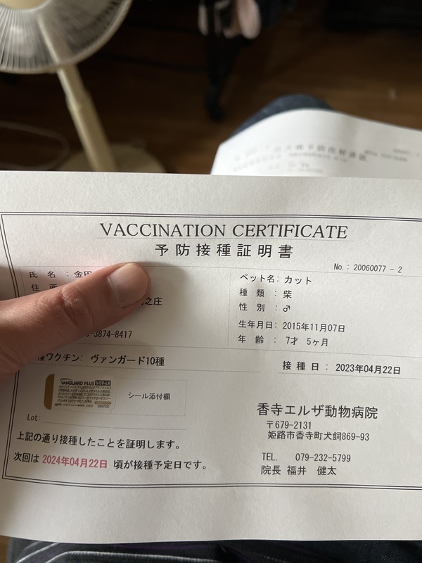 | ワクチン | 済 | 不妊去勢手術 | 未 |