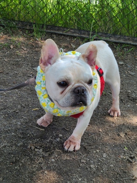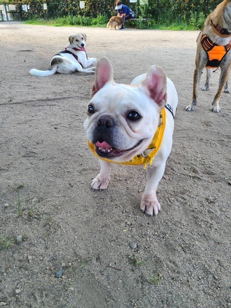 | 特徴(性格など) | 名前:こぶだい 犬種:フレンチブルドッグ 性別:メス♀ 毛色:ホワイト 年齢:5〜6歳くらい 体重:8.5kgくらい 性格:人懐こく、人が動けばテクテクと付いて回ります。 食べる事が大好き、撫でてもらったり触ってもらうのも大好き、お外も大好きで、散歩では楽しそうにしっかり歩きます。 パワフルな一面もあり、ワンプロに参加して遊んだり、ドッグランで走り回ったりもします。 チャイムや、扉の開閉の音などに敏感で、吠える事があります。 執着心がすごくて、興味のある物には何としても向かって行ったり、一旦咥えると離さない所もあります。 興奮してくると、制御が効きにくくなるので、注意必要です。 トイレは8割ぐらいシートで出来ます。 留守番も短時間はゲージで出来ますが、うんちをしてしまうと踏んでしまう事があるので工夫が必要です。 よく食べ、よく遊び、よく寝る! とっても可愛い元気いっぱいのフレブルちゃんです。 |
