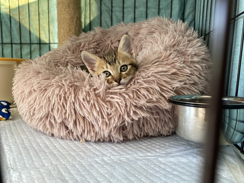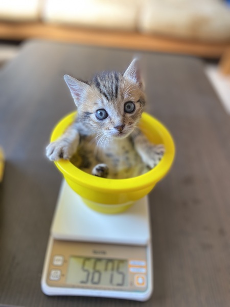 | 特徴(性格など) | 幼名:竹千代 男の子 クラッシックタビー(渦巻き模様)と短いしっぽが可愛い子猫 一緒に捨てられていた兄妹は死んでいた為、 ひとりっことして甘やかして育てています。 まだ子供なので食事は1日4回程。 小さいうちはお留守番はあまりできません。 充分な脱走対策(柵やドア)をお願いします。 |
