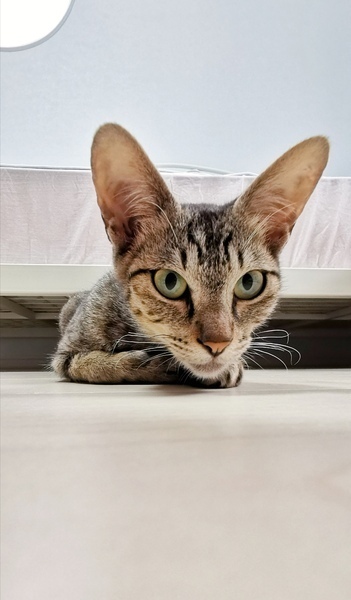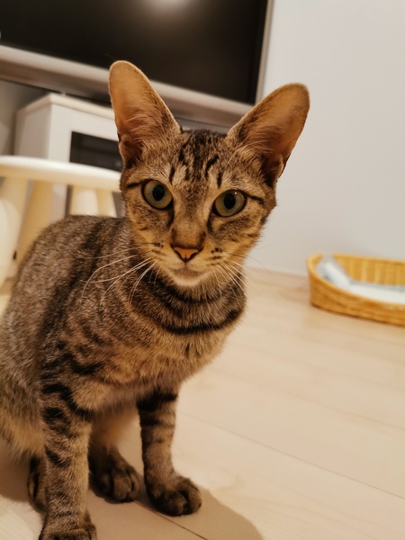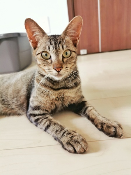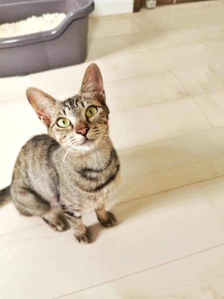 | 特徴(性格など) | ・キジトラ メス 生後約6ヶ月 ・耳や手足が大きめ お顔はシャープ アビシニアンに似ている気がします☆ ・エイズ 陽性 避妊手術の予定あり 甘えん坊でかまってちゃんの女の子です。 人懐っこくて誰でもすぐに打ち解けられます。 すぐにゴロンとして甘えてきたり、人の後ろをついてまわってとても可愛いです! また、猫じゃらしやねずみのおもちゃで全力で遊びます! 遊びたい盛りなので沢山遊んであげてください^^ |