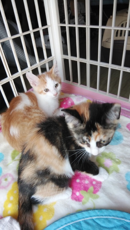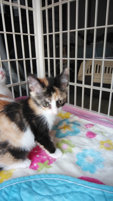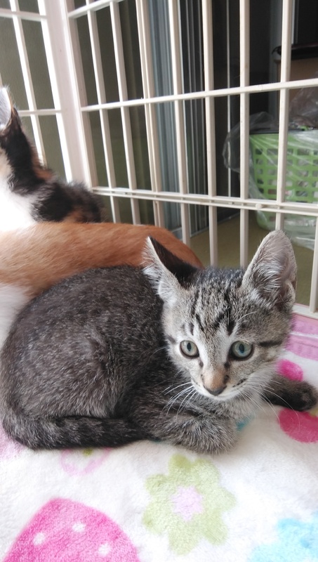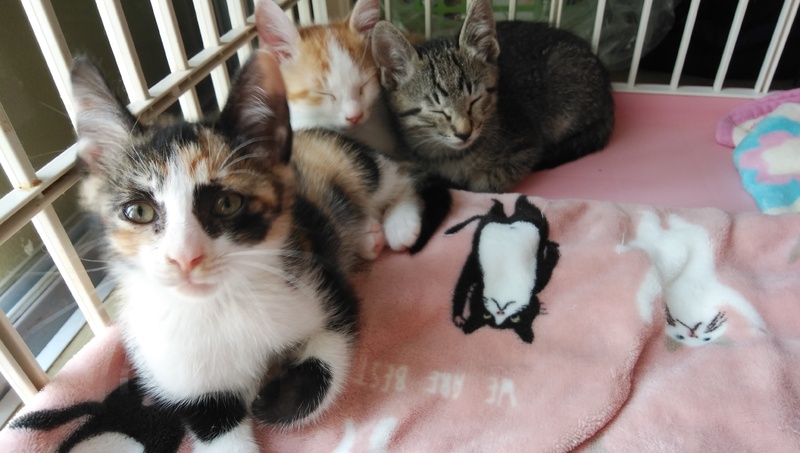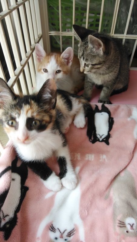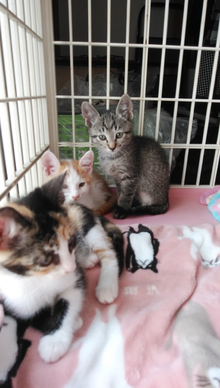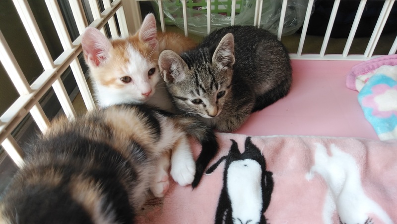 | 特徴(性格など) | 白茶男の子、三毛女の子、きじ男の子です。ボランティアさんが育てられたので人懐こい仔猫ちゃん達です。兄妹です。エイズ白血病陰性です。 | ||