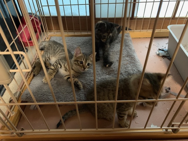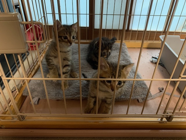 | 特徴(性格など) | 3匹ほどいます。 3匹のうち、2匹はキジ柄のオス猫です。1匹は尾が曲がっていて、もう1匹は綺麗に伸びています。 3匹目は、メス猫でサビ模様になります。 どの子も健康状態は良好で、現在はゲージの中を走り回っているくらい元気です。 目がくりくりしていて、とてもかわいらしい子達です。 |