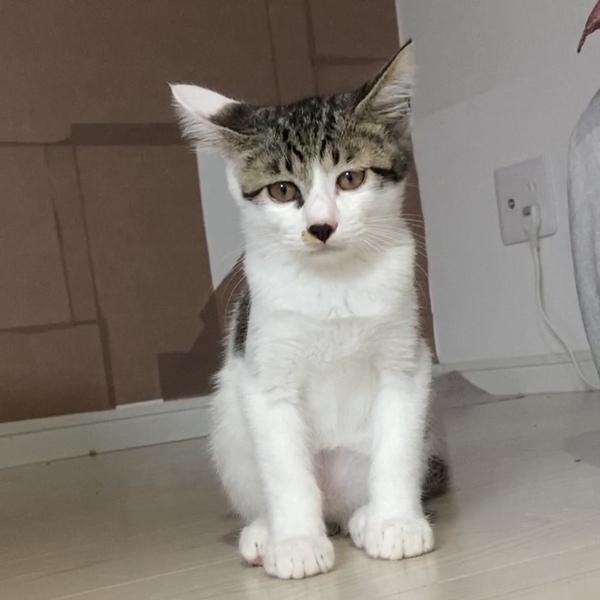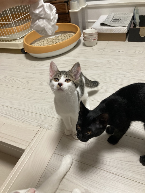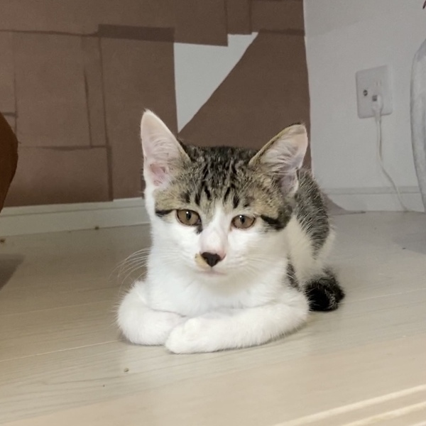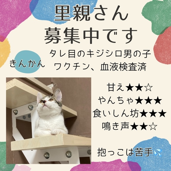 | 特徴(性格など) | キジシロでみんなと仲良く遊ぶ、優しい男の子です。 あんまり気が強い子ではないので、どこか1歩ひいてる感じがあります! ねこじゃらしや、おやつは大好きで手から食べてくれるので、飼いやすい子だと思います。 しっぽ長め、タレ目で愛嬌のあるお顔が可愛いです! 目がアンバー的な茶色で、すこし珍しいかなと思います! 猫好きの猫なので 多頭飼いで考えてらっしゃる方にもいいと思います! |