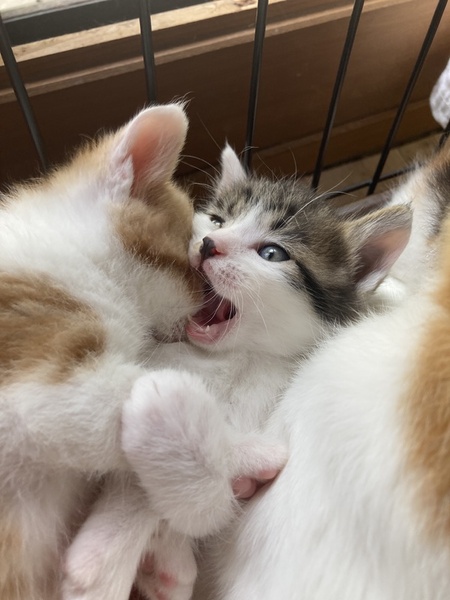 | 里親募集する理由 | 3月後半に保護した妊婦のミケちゃんが 4月1日に産んだ子猫5にゃん兄弟の中の1匹です。 お母さん猫は6/10、不妊手術済。 お腹パンパンの母猫をどうしても堕胎させることができず 我が家には他にも7匹猫がいるのですが 里親さんに繋げたい希望をもって保護しました。 |