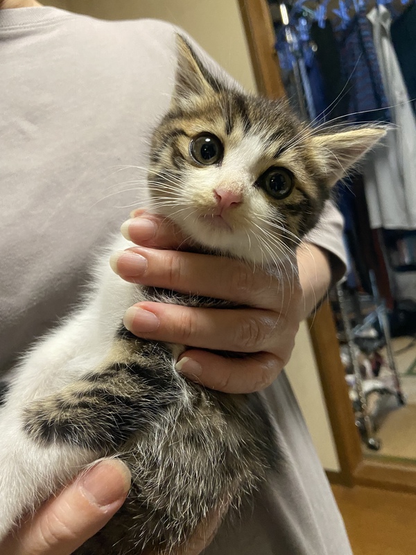 | 里親募集する理由 | 近隣でママ猫と子猫を見かけたので、保護して里親さんを探す事にしました。 病院にて、診察・ノミダニ駆虫済み 保護時の体重670gです |