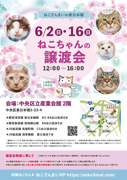 | その他(譲渡条件など) | 11:30より、2階会場入口にて受付を開始します。 受付時に入場予定時間が記入された整理券をお配り致しますので、整理券を受け取った方はお時間になりましたら2階会場入口に番号順にお並び下さい。 ※11:30より早くいらしてもお待ちいただく場所がございません。 また、近隣にお住まいの方や他階フロアのご利用者様にご迷惑となる場合がございますので、受付開始時間にあわせてお越しくださいますよう、何卒ご協力お願いいたします。 ※ねこざんまい譲渡会は、先着順で里親様を決定する譲渡会ではありません。 先に申し込みをした方を優先することもありません。 お話をして、その猫ちゃんに合ったおうちに決めさせていただいております。 12時に開場し、里親様の決定は14時以降となります。 14時以降にご入場の場合、希望の猫ちゃんが決定している可能性があります。 また1頭に対し多数のご希望をいただいた場合、早めに申し込みを締め切らせていただく場合がございますので、予めご了承下さい。 里親様決定は14時以降となります。 その後、迎え入れ準備の説明等のお時間も頂戴しますので、お時間に余裕を持ってご来場下さい。 ~~~~~~~~~~~~~~~~~~~~~~~~~~~~~~ ★仔猫ご希望の里親様★ 仔猫ちゃんたちは、まだ体がしっかりしていない赤ちゃんです。 下痢だけでも数時間対応ができなかっただけ死に至る事もあります。 その為、月齢に応じたお留守番時間を設けさせていただいております。 また、子猫ちゃん(6ヶ月未満)の里親様には子猫支援金のご協力をお願い致しております。 ★猫ちゃんとのお見合いは譲渡会で!★ ねこざんまいの猫ちゃんは譲渡会でのお見合いのみとなります。 『この子はいつ譲渡会に参加するの?』『譲渡会場の場所はどこ?』などは、ねこざんまいホームページをご覧ください。 https://neko3mai.com/ ★楽しく猫ちゃんと触れ合って★ ねこざんまい譲渡会は、猫ちゃんも里親様も保護主も笑顔で過ごせる譲渡会を目指しています。 これから20年以上、楽しい時も、悲しい時もいつも傍にいてくれる大切な家族になる猫ちゃんです。 会場には沢山の猫ちゃんがいます。 1匹1匹、触れ合って猫ちゃんとお話してください。 『初めて猫ちゃんを家族に迎える方』 『先住猫ちゃんのお友達を迎える方』など トライアルの仕方や先住猫ちゃんと仲良くなるコツなど経験豊富な保護主やスタッフにお気軽にご相談ください! 猫を愛し、そして猫に愛されている猫好きスタッフと保護主がアドバイスさせていただきます。 ★里親希望のみなさまへ★ ペットではなく、家族一員としてたっぷり愛情を注いでくださるご家庭をお待ちしております。 恐れ入りますが ●学生の方 子猫・幼猫希望の60才以上の方のみのご家庭 ●脱走防止対策にご協力いただけない方 は原則譲渡を遠慮させていただいております。 ●一人暮らし・同棲(事実婚)の方 保護主の希望や猫の年齢・性格等により、ご希望に添えない場合もございます。 参加猫ちゃんは、それぞれ保護主(実際に猫ちゃんを自宅に入れ、保護をしている方)が異なります。 詳しい条件なども異なる場合がございますので、会場内で直接保護主とお話ください。 〖共通条件〗 1.終生飼育 2.完全室内飼い 3.脱走防止対策へのご協力 4.避妊去勢手術 5.契約書類へのサイン 6.定期報告 7.医療費等の負担 当日の猫ちゃんを連れて帰ることはできません。後日、保護主が里親様のご自宅までお届け致します。 その為、移動の際の猫ちゃんの負担を月齢などから考慮し、お届け地区を限定させて頂くこともございますのでご了承ください。 ご理解とご協力のほど宜しくお願い致します。 ☆よくある質問☆ ・譲渡の条件 ・ご負担頂く費用 ・譲渡会の場所等は ホームページに詳しく掲載させて頂いておりますのでご覧ください。 https://neko3mai.com/ メールでのお問い合わせはすぐにご返答出来ない場合がございますのでご了承ください。 ホームページ https://neko3mai.com/ お問い合わせ http://www.neko3mai.com/contact/form_general.html ねこざんまいブログ http://ameblo.jp/neko3mai/ |