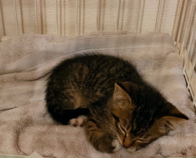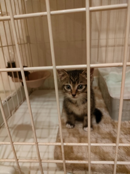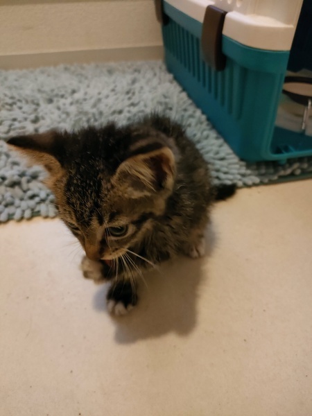 | 里親募集する理由 | 交通量の多い大通り沿いで一人でうずくまっているのを車で通っていた時に発見し周りを見渡しても親猫や兄妹猫は見当たらず木陰に隠れた所を保護。 ほっておいたら死んでしまうと保護しましたが 現在我が家には病気の老猫と他に3匹いる為 家族として一生この子を大切にしてくださる方を探して募集を出しました。 |