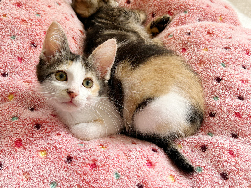 | 特徴(性格など) | 三毛猫で仮の名前をりんちゃんと呼んでいます。 5月8日に269gの時に保護してから、妻が大怪我のため長期入院中なのでずっと私ひとりで世話をして育て、昼間は仕事に出るので平日の昼間だけ近所の親戚親子にサポートを頼みここまで大きく育てました。 現在1.3kgを少し切る体重です。 性格はもとからとても甘えん坊で、そのうえで私と親戚が大切に育てましたので超甘えん坊、様子を見に来る友人にも全く人見知りせず、どなたにでもフレンドリーです。 びっくりするほど人には警戒しませんし、凶暴性はありません。 ものすごくおしゃべりで目が合ったときはもちろん、部屋に一緒にいるとにゃーにゃー話しかけてきてそばから離れません。 しっぽは短めのカギしっぽです。 |