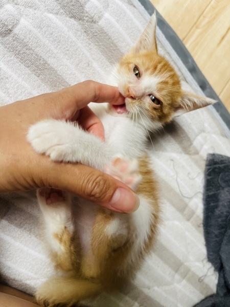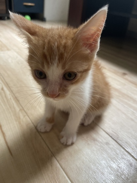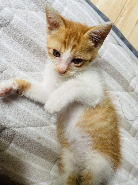 | 特徴(性格など) | 【色】 白×オレンジ しっぽの先が少し折れています 肉球は全てピンクです 【性格】 やんちゃで甘えん坊。 遊ぶことが大好きなので、先住猫さんが居ても仲良くやって行けると思いますら。家ではしゅんすけのみですが楽しく遊んでおります。寝てる時、ご飯を食べている時、トイレ以外は殆ど私と遊んでます!後追いをして足に飛びついてきたり遊びながら寝てしまったり寝てる横で少し動くだけで喉を鳴らすなど甘えん坊な面が沢山あります✨ |