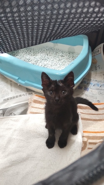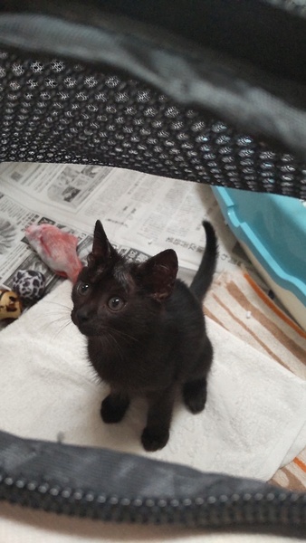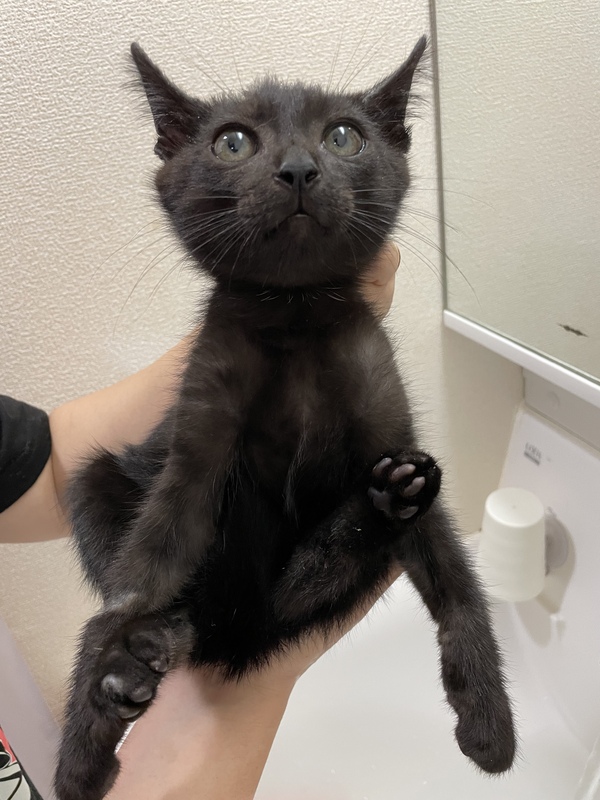 | 特徴(性格など) | 真っ黒子猫です♡ 男の子(推定3〜4ヶ月) エイズ、白血病陰性 ノミダニ駆除済み 猫じゃらしが好きで1人でずっと遊んでいます笑 トイレも上手に出来ます。 ナデナデされるのも好きです。 猫カビ治療中で、飲み薬、塗り薬、シャンプー処方され順調に改善しています。 飲み薬もご飯に混ぜて問題なく食べています(^^) |