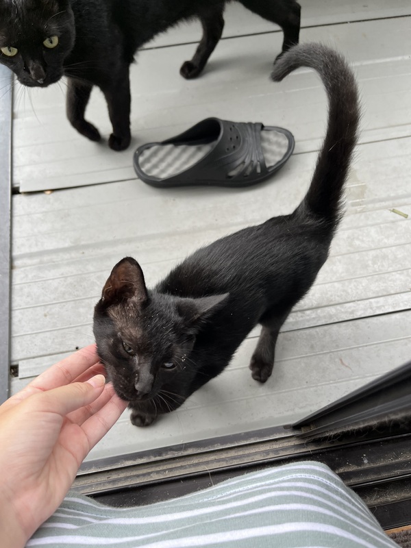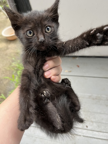 | 特徴(性格など) | 黒猫の男の子です。兄弟に比べ少し体が大きいです。 とても人懐っこく、家に入ってこようとするくらいです。 |