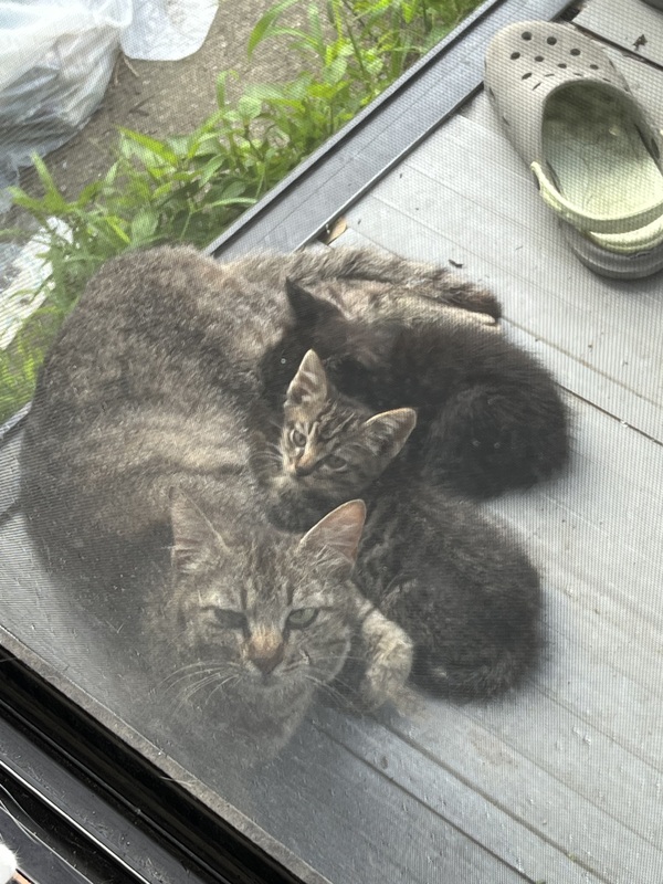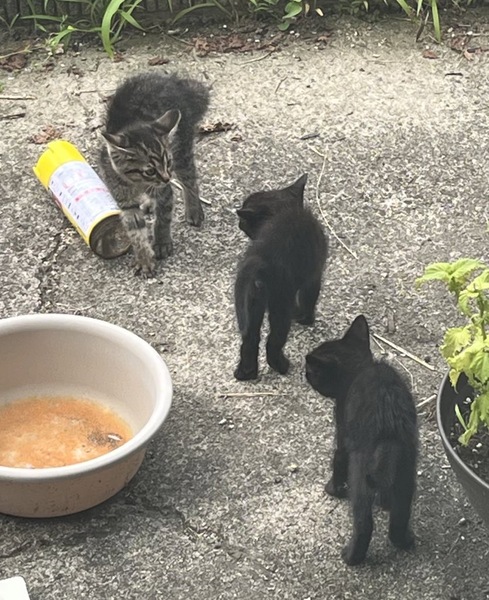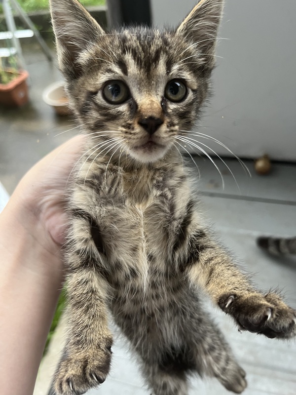 | 特徴(性格など) | 濃いめの色のキジトラです。 母猫とよく一緒にいて甘えん坊です。また、好奇心旺盛みたいでよく虫と遊んでます。 |