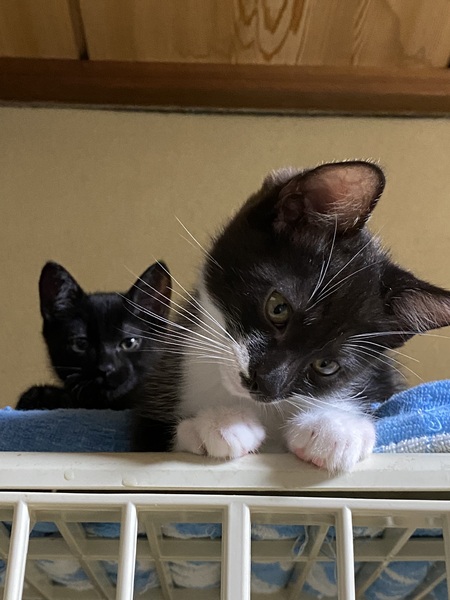 | 特徴(性格など) | 黒の男の子と白黒の男の子です。 二匹ともとても元気です。 毎日走り回っております。 2匹とも猫じゃらしで遊ぶのが大好きです。 黒の男の子はとても優しい子で、兄弟の毛づくろいをしたりします。 私の手をペロペロと舐めてくれています。 白黒の男の子はとても好奇心旺盛で、先住猫ちゃんにも果敢にちょっかいを出したりしてます。物怖じしない子です。 主の背中に乗って遊んだりします。 生まれた時から2匹とも人間と一緒にいるので、人には慣れてます。 とても元気なので、いろいろなもので遊んだりしています。 どちらともに抱っこしても引っ掻いたりしないでおとなしいです。 ただ、遊びたいときは、抱っこをさせてくれません。 とても可愛い子達です。 |