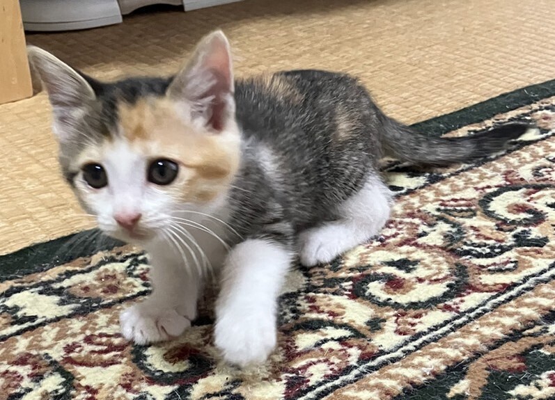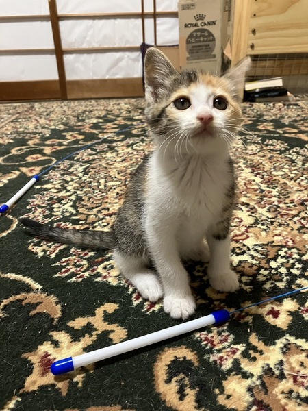 | 特徴(性格など) | 4兄妹の中でたったひとりの女の子✿ 男の子に負けじとニャンプロに誘いますが、結局負けて逃げてきます(*^^*) 生後1ヵ月くらいで左手を骨折し、保護した際にはまだしっかりくっついていない状態でした。 獣医の診たてでは、成長には問題ないところなので、自然治癒したら分からないとだろうと言うことです。 人馴れ抜群!性格は最高に良いです(*・ᴗ・*)و |