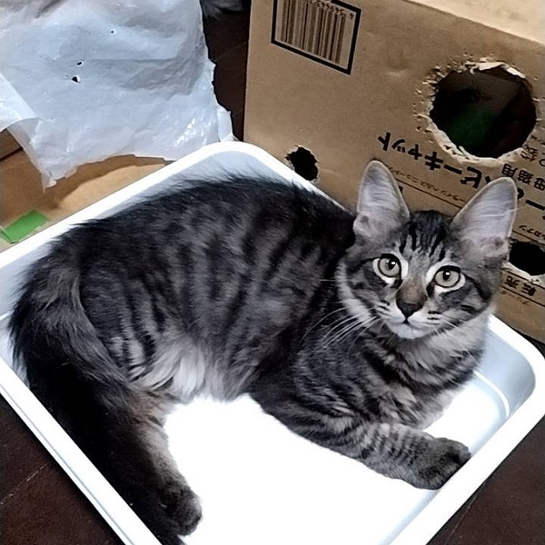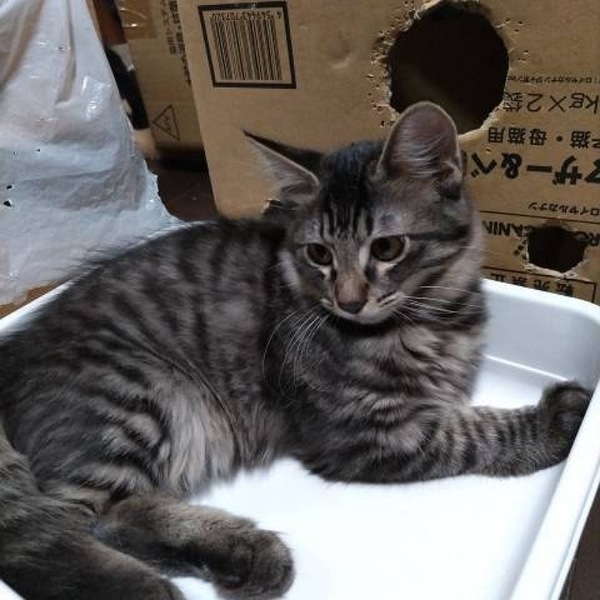 | 里親募集する理由 | 車庫の中に置いた段ボール箱。 その段ボール箱の中で子猫を産み始めていた母猫ごと保護しました。 |