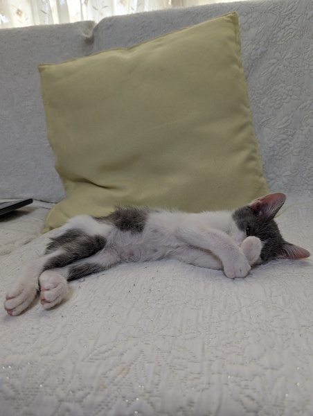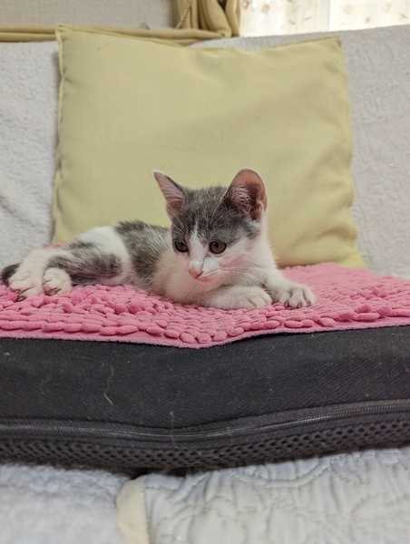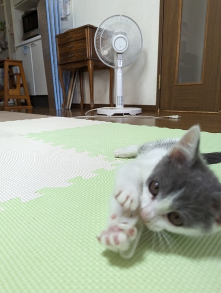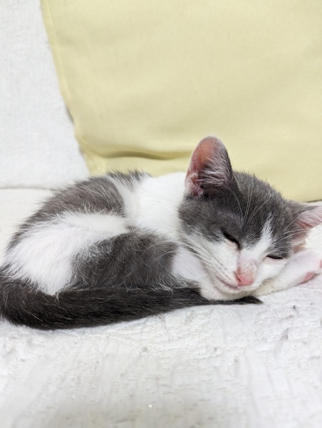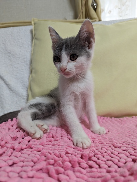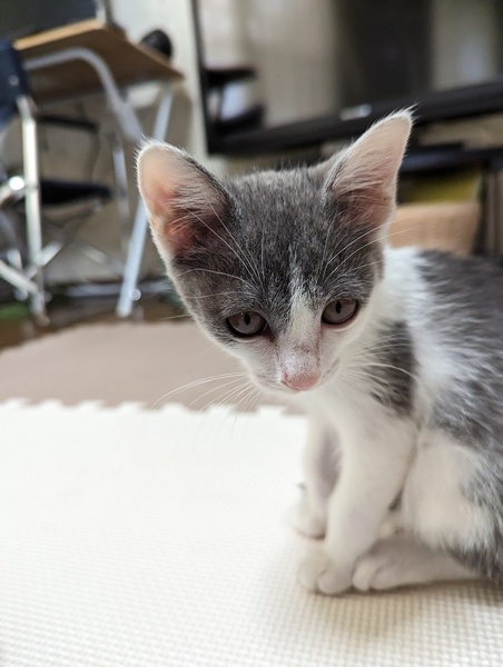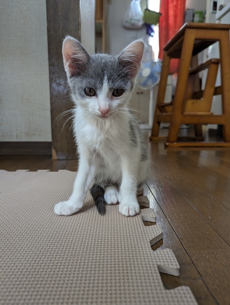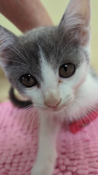 | 特徴(性格など) | 保護した最初の3日間はシャーシャー言って部屋の隅っこに隠れていましたが、今は膝の上で寝たりするくらい慣れてきました。 トイレはペットシーツでします。猫砂も横に並べていますが、一度も使いません。ペットシーツがいいようです。 眠たくなると膝に乗ってくる甘えん坊さんです。 病院でもおとなしく先生に診せてくれます。 |