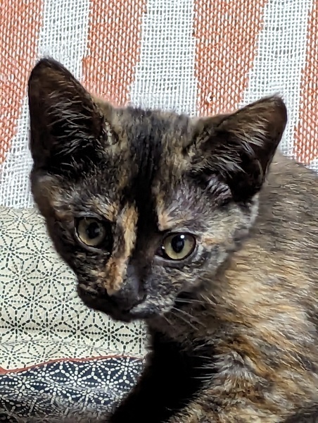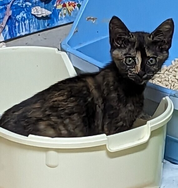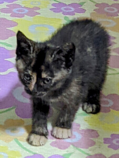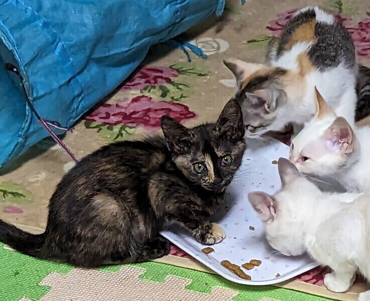 | 特徴(性格など) | サビ柄は、猫の毛柄の中で一番賢いと言われています。 独特な個性的な柄がチャームポイントです。 手の先がベージュのサビの可愛い女のコです。 5兄弟の中で一番臆病で賢い子です。いつもご飯も最後に食べだす控え目なサビらしい性格です。 でも、ちゅーるが大好きで、おやつの時は指に齧り付いて食べています。 抱っこは苦手ですがナデナデすると小さな声でゴロゴロ言ってくれます。 兄弟と楽しそうに走り回って遊んでいる元気な女のコです。 |