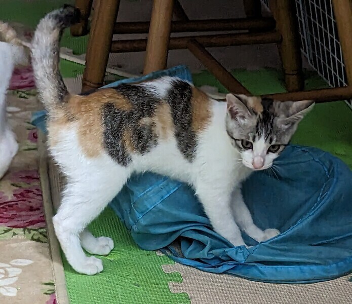 | 特徴(性格など) | 女のコらしいホワっとした とっても可愛いミケちゃんです。 クリクリお目々でお話ししてくれます。 お腹は真っ白ホワホワです。 良く食べ、良く遊び、お腹をだして寝ています。 |