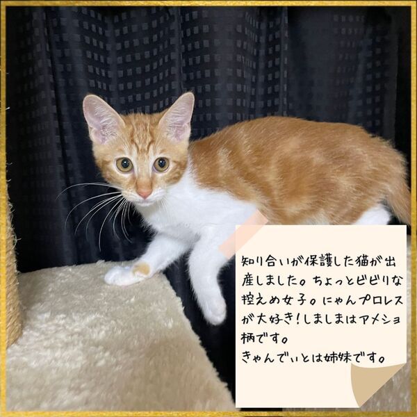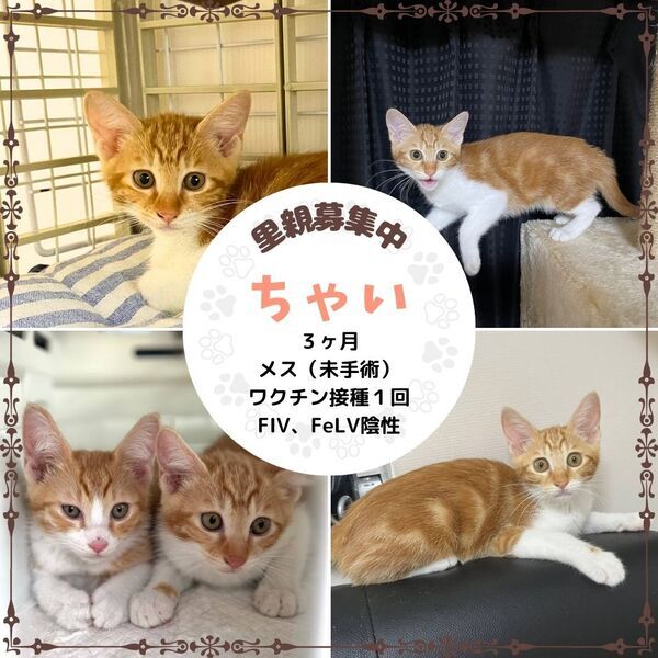 | 特徴(性格など) | (仮名:ちゃい) ちょっとビビりな控えめスレンダー女子! にゃんプロレスが大好き しましまはアメショ柄です 〔きゃんでぃチャンと姉妹〕 姉妹で里親になってくださると嬉しいです 【医療処置】 猫エイズFIV陰性 猫白血病FeLV陰性 ノミダニ駆虫済み ワクチン接種済み(1回) |