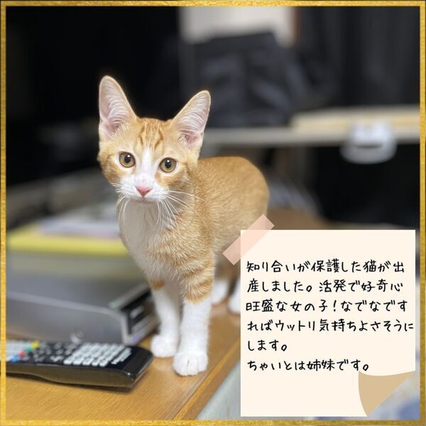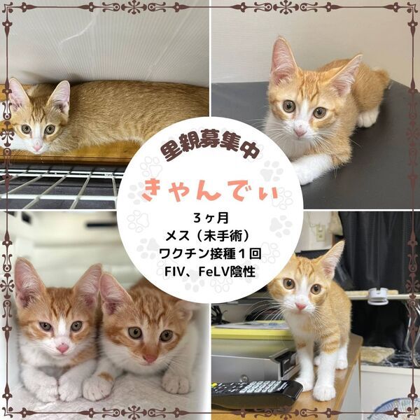 | 特徴(性格など) | (仮名:きゃんでぃ) 活発で好奇心旺盛な女の子 撫で撫ですればうっとり気持ち良さそうにします! 縞々は薄め。 〔ちゃいチャンと姉妹〕 姉妹で里親になってくださると嬉しいです 【医療処置】 猫エイズFIV陰性 猫白血病FeLV陰性 ノミダニ駆虫済み ワクチン接種済み(1回) |