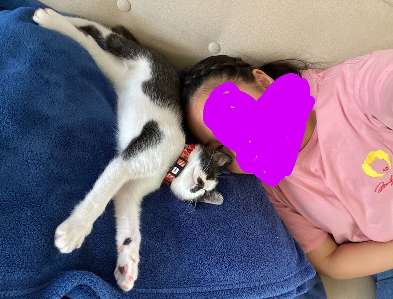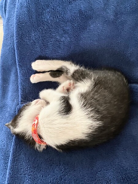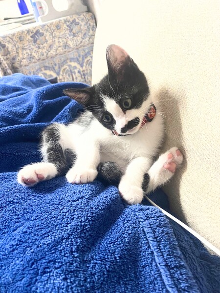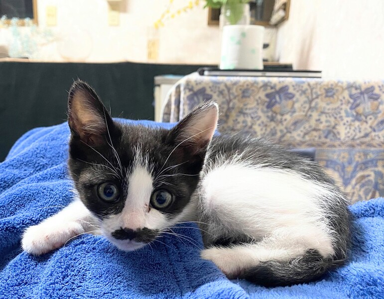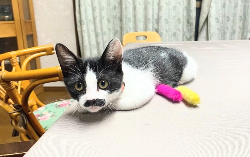 | 特徴(性格など) | 白黒、チョビひげ模様の可愛い女の子です。 ミルクから人の手で育てられたので、とっても人懐こくて甘えん坊さんです。ねこじゃらしで遊ぶのが大好きです。 |