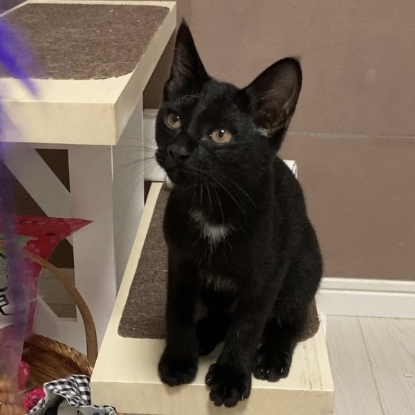 | 特徴(性格など) | フレンドリーで子猫らしい性格の、黒毛メインの女の子です。黒くて目が埋もれてますが、、笑 喉もとに白毛がツキノワグマみたいで可愛いです♡写真や動画、ご覧下さい♡ しっぽは、短すぎて無いです! 最初は誰よりもビビっていましたが、慣れたらよく遊びよく食べる、自由で子猫らしい性格であることがわかってきました。 イタズラしたり追いかけっこしたと思えば、ヘソ天でハンモックでゴロゴロ言いながら寝ています(笑) 比較的1匹でも平気そうですが、他の子とも仲良くできるので、おうちの子のお友達を探してらっしゃる方にも向いてるかと思います。 夜はケージで寝るようにくせつけてます! |