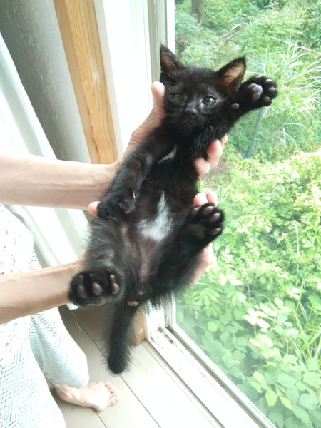 | 特徴(性格など) | 胸とお腹付近にエンジェルマークの白い毛があり先端がカギ尻尾の黒猫 約1.5ヵ月位です。 物怖じせず 人に触って遊んでもらうのが大好きです。 ウンチ おしっこ共に良好 トイレも上手です。 |