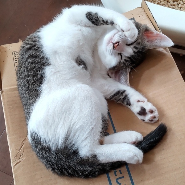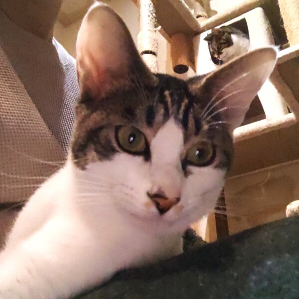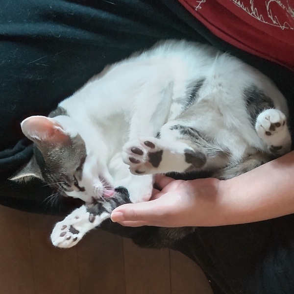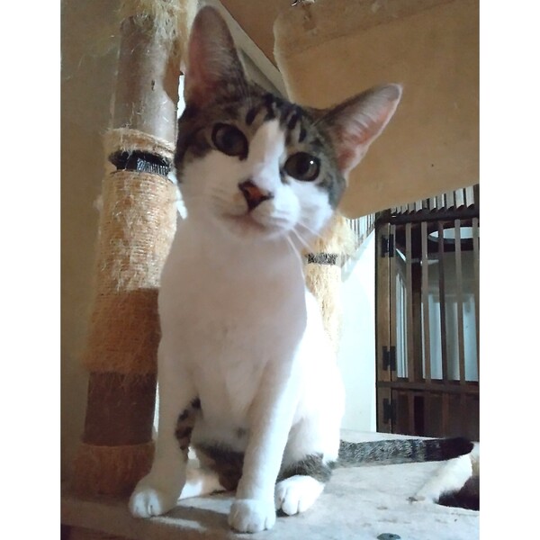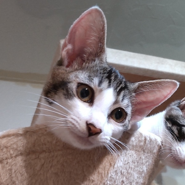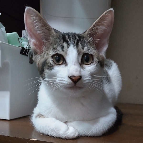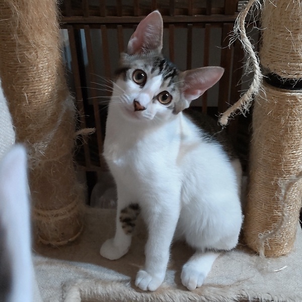 | 特徴(性格など) | 仮名:ラブ 毛色:キジ白 瞳の色:茶色 尻尾:長くてまっすぐ 体重:2.65kg(11月9日現在) 性格・特徴:くっきりアイラインの大きなお目目ですが、まん丸ではなくちょっと憂いがあるような勇ましいような印象のある形で、少しフェネックやミーアキャットに似ています。 とても小柄で、男の子3匹の兄弟に紅一点ですが、男の子たちに負けずに日々にゃんプロを繰り広げています。 キジ白といっても背中にはシマシマがなく、ちょうどアビシニアンの黒バージョンのような感じの珍しい柄です。 その柄が亀の甲羅のような位置にあって、唯一無二の個性になっています。 保護時はシャーシャーと空気砲とひっかきのオンパレードでしたが、数日のうちに、逃げずに触らせてくれるようになりました。 生後4から5カ月のじゃれじゃれ期には、遊びたい時に甘噛みとパンチ、キックが出ていましたが、6カ月過ぎるとほとんど出なくなり、まるっきりのスリゴロちゃんに変身。 立っていると足にスリスリしてきて、足の間に挟まってくつろいだり、足の上に座ったりします。 床に座ると足や背中にゴロンとしてからピタッとくっついてきたり、おヒザにも乗ってきたりするようになりました。 ほかの兄弟に比べて2回りほど小さいので、おヒザの上でちょこんと香箱座りをすると悶絶級のかわいさです。 お兄ちゃんのピースをはじめ、一緒に保護されている子と2匹での譲渡を希望します。 知らない猫さんには最初の数日だけ威嚇が出ますが、その後は徐々に慣れて仲良くなっていけるので、先住猫さんのいるお宅でも大丈夫です。 健康状態:快食快便の健康優良児です。 猫白血病、猫免疫不全ウイルスともに陰性。 ノミ・ダニ・お腹の虫の駆除済み。 マイクロチップ装着済み。 (登録申込書をお渡ししますので、ご自身で手続きをお願いします) |
