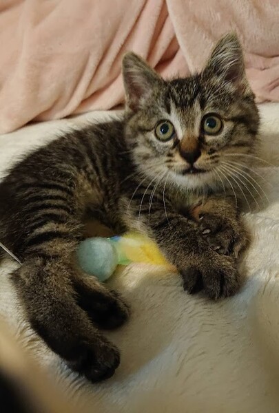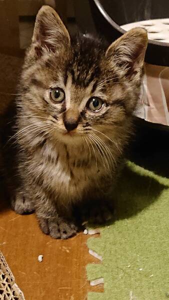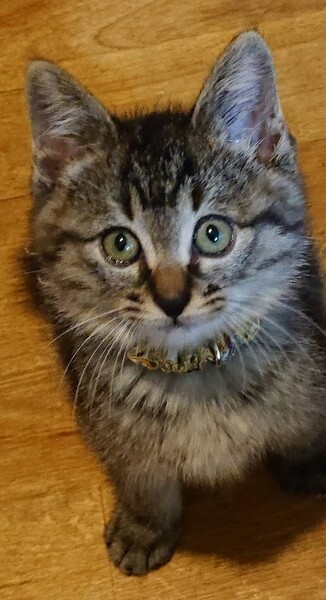 | 特徴(性格など) | 仮名: 咲ちゃん、メス 毛色: 長毛または半長毛のキジトラ 性格: 保護時から人馴れはしていましたが、少しビビリなところがあります。おもちゃで良く遊び、ご飯も大好きです。他の猫に対しては、初めは1歩退いて隠れてしまいますが、徐々に距離を詰めてきますので、先住猫のいるおうちでも大丈夫だと思います。 女の子ですが、手が大きいので大きく成長すると思います。 検便済 駆虫済 3種混合ワクチン済 猫エイズ・白血病ウィルス検査はともに陰性 |