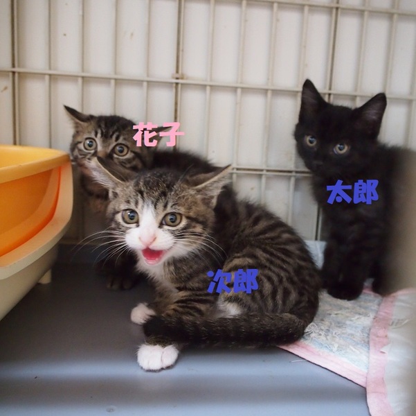 | 特徴(性格など) | 黒い子が太郎君、オスです。 キジ白の子が次郎君、オスです。 キジの子が花子ちゃん、メスです。 最初はかなり緊張していましたが、ずいぶん馴れてきました。 |