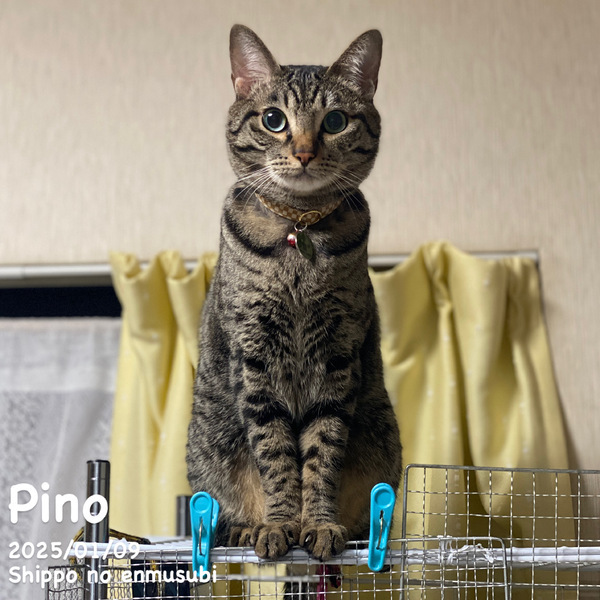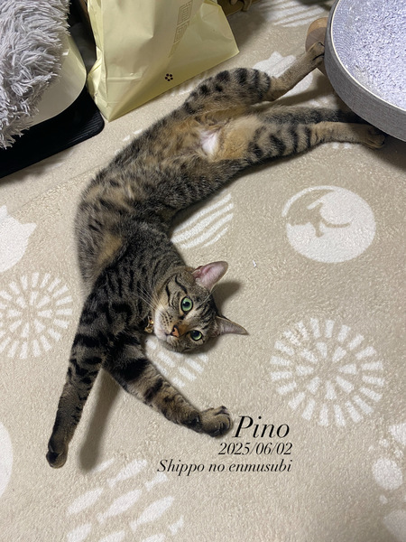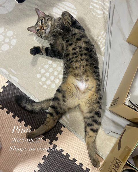 | 特徴(性格など) | 仮 名:ピノ 保護日:2023年6月28日 性 別:オス(去勢済) 毛 色:きじとら 誕生日:2023年6月(推定) 性 格:元気もりもり!あまえんぼう! 食欲旺盛、好奇心旺盛、誰とでも仲良く出来ます。 よく食べ、よく遊び、よく寝る!健康優良児♪ 育てやすい良い子です^^ 日々の様子はInstagram&Facebookにアップしています。 【しっぽのえんむすび】で検索してくださいね♬ 治療歴等:駆虫済、ワクチン2回摂取済、FIV陰性、FeLV陰性、マイクロチップ済 |