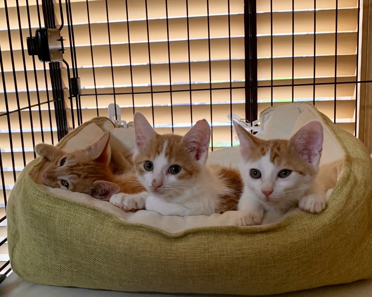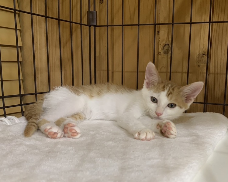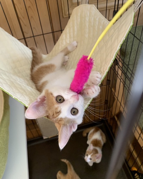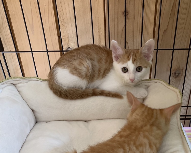 | 特徴(性格など) | 遊ぶのが大好きな茶白の男の子です。 少しビビりなところがあります。 すばしっこく走り回り、兄弟で追いかけっこをしたり、猫じゃらしを追いかけています。 段々と人にも慣れてきました。 大人の猫が大好きで、近くに来ただけで、ピャーピャー騒いで構ってアピール、くっつきたがります。 遊び疲れると、兄弟でくっついて寝ています。 |