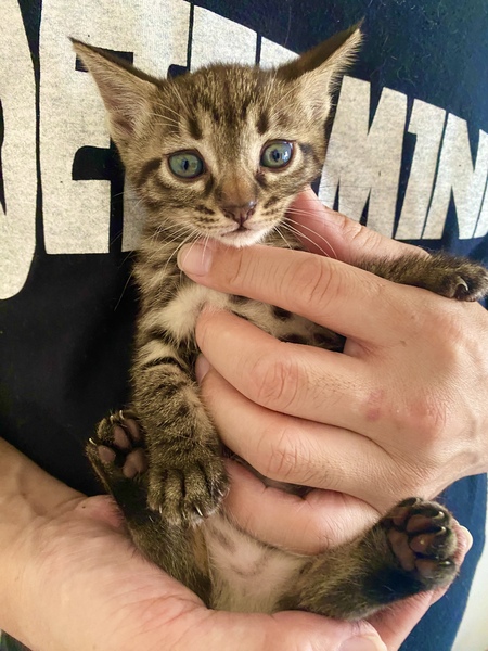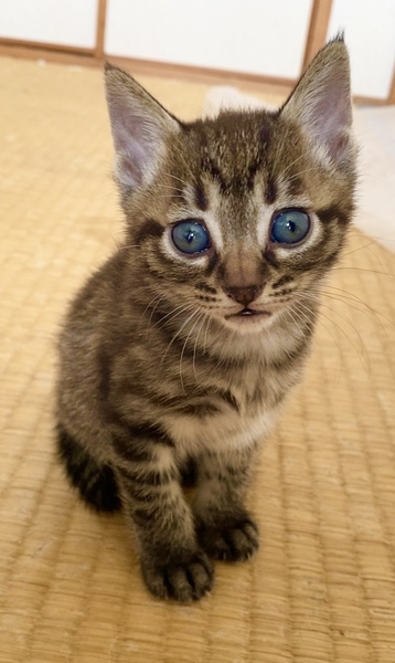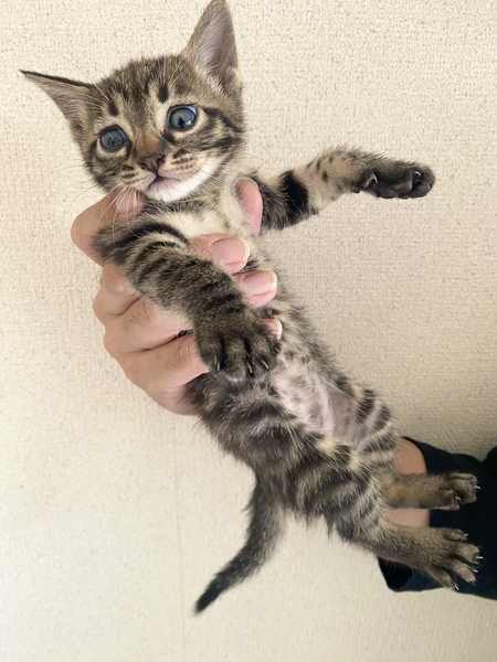 | 特徴(性格など) | 黒っぽい柄のキジトラ子猫です。 きょとんとこちら見ている顔がとっても可愛いです。 お利口さんで、トイレも上手にできています。 診察してもらったところ、病気もなく、体重も順調に増えています。 |