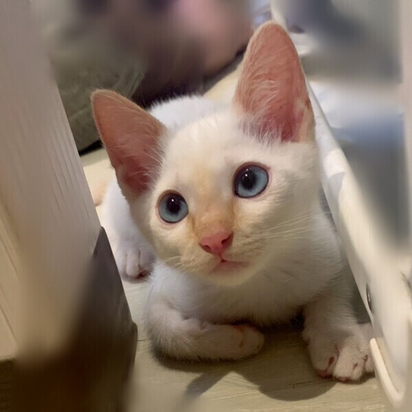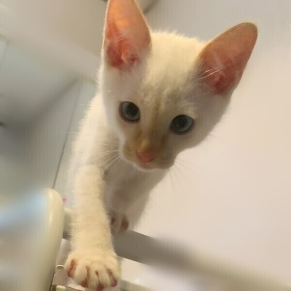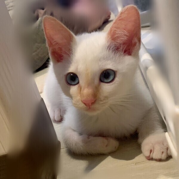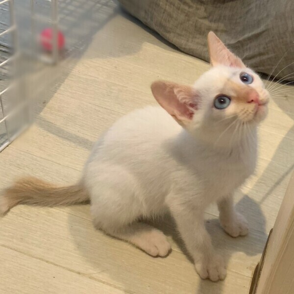 | 特徴(性格など) | 超甘えん坊で、後追いをしてきます。 肩のり猫で、呼ぶと返事をしてくれます。 また、一人遊びが上手で、一人でもせっせと遊んでくれます。 猫じゃらしやボールで上手に遊ぶことができ、一緒に遊ぶこともできます。 遊んで欲しかったりご飯をもらいたいときに鳴きますが、そんなにずっとわがまま言うことはなく、お世話しやすい猫ちゃんです。 柄は白地にポインテッド(シャム猫みたいな柄のことです)で薄くて明るめの茶色が混じっています。 現在は鼻先と耳、そして尻尾が薄い茶色です。 目ははっきりとした水色でお鼻はピンク色です。 やんちゃ、元気!愛くるしい!!! 愛嬌のある可愛い猫ちゃんです。 |