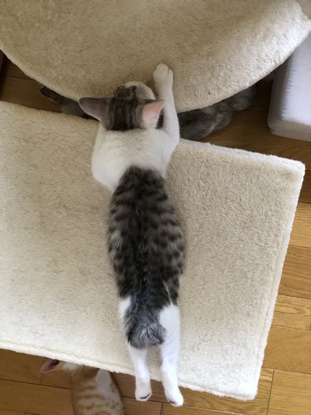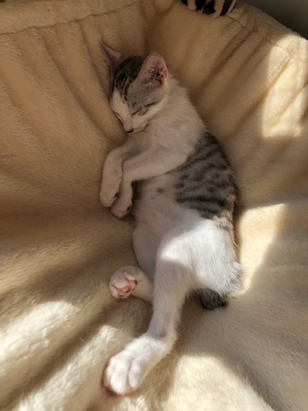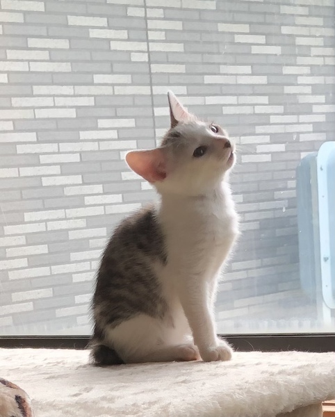 | 特徴(性格など) | サバトラでしっぽがちょっとしかありません! 兄妹の中で1番お姉さんって感じで、みんなより先に新しいことをする子です! 兄妹のことをなめてあげたりお世話好きなおませさんです! 兄妹のゲンジくんと一緒にお迎え希望です! |
