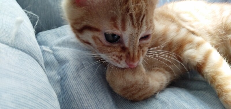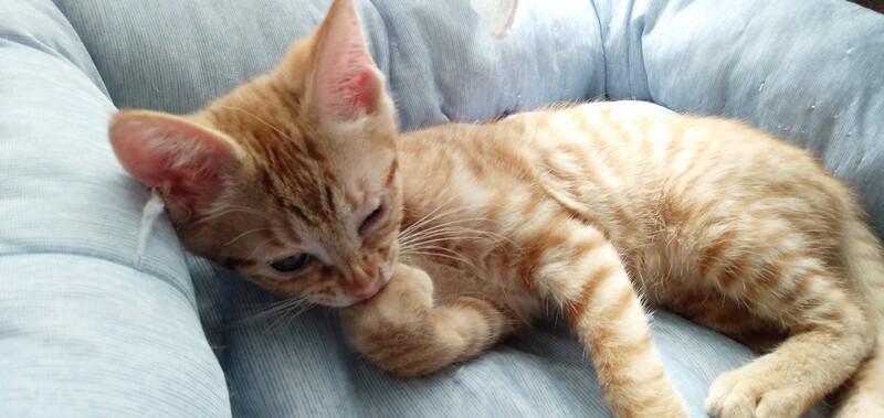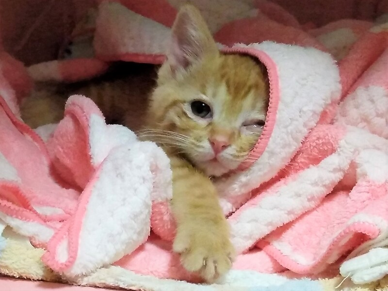 | 特徴(性格など) | 茶トラ女子 保護時、酷い風邪をひいていて左目が癒着してしまい、治療し、経過順調です。 毎日の目薬は必要ですが、視力はあるようで希望を持てます。 保護時の栄養状態が悪かったので、生後3ヶ月ですが、体重は1キロちょっとで小柄です。 現在は元気いっぱいに遊んでいます。 硬いカリカリも食べれらるようになりました。 エイズ陰性 白血病陰性 ノミダニ駆除済、検便済 たくさん遊びます。 甘噛みをよくします。 人も猫も大好きです。 ふみふみちゅっちゅっをよくしていて、とても甘えん坊さんです。 さみしがり屋さんなので、お留守の時間が少ない方に譲りたいと思います。 |